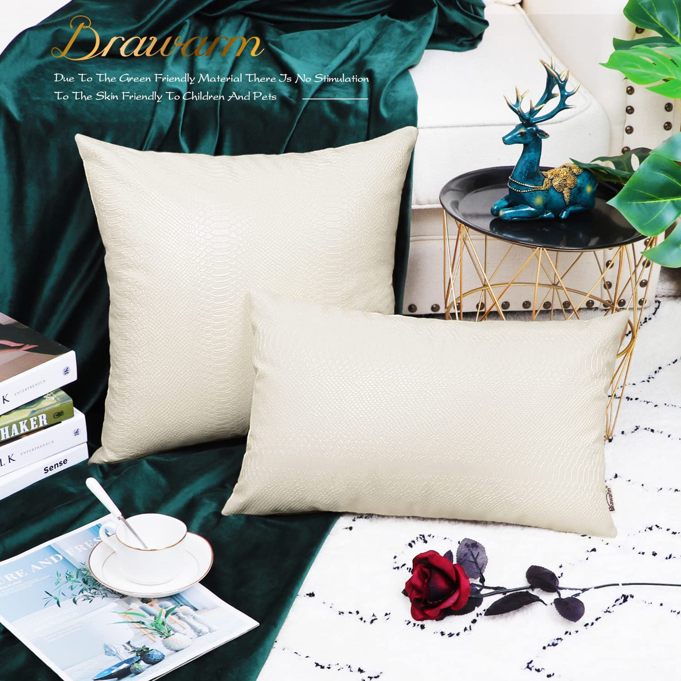 Brawarm Ivory White Leather Throw Pillows 18 X 18 Inches, Snake Leather Pillow Covers Pack Of 2, Faux Leather Decorative Pillow