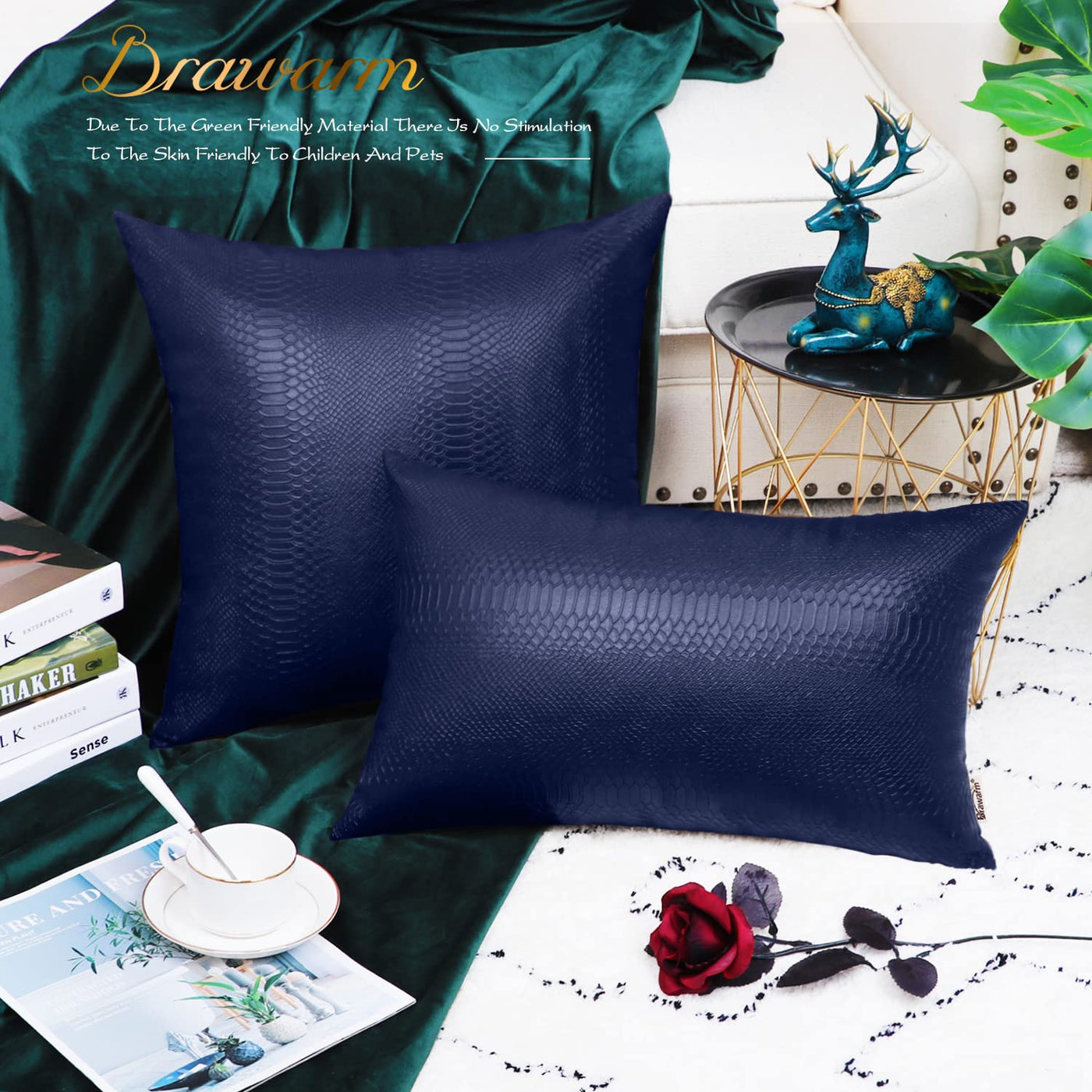 Q: What sizes are available for the Brawarm Navy Blue Faux Leather Pillow Covers?A: The Brawarm Navy Blue Faux Leather Pillow Covers are available in multiple sizes: 12" X 20" for rectangular pillows, 18" X 18" and 20" X 20" for square pillows. Each size option accommodates specific pillow stuffing dimensions.