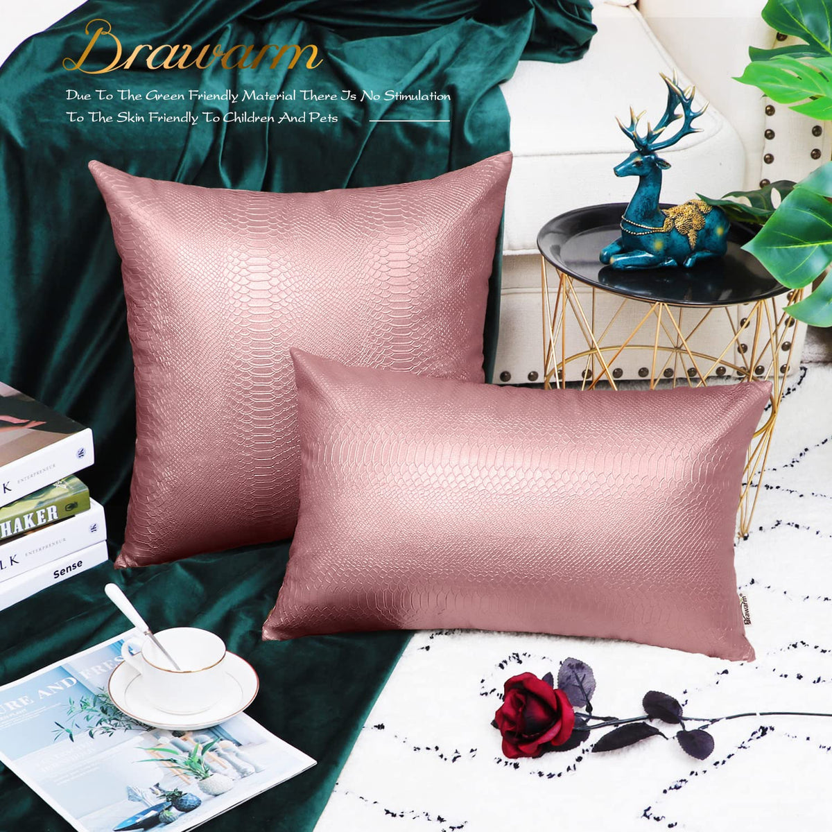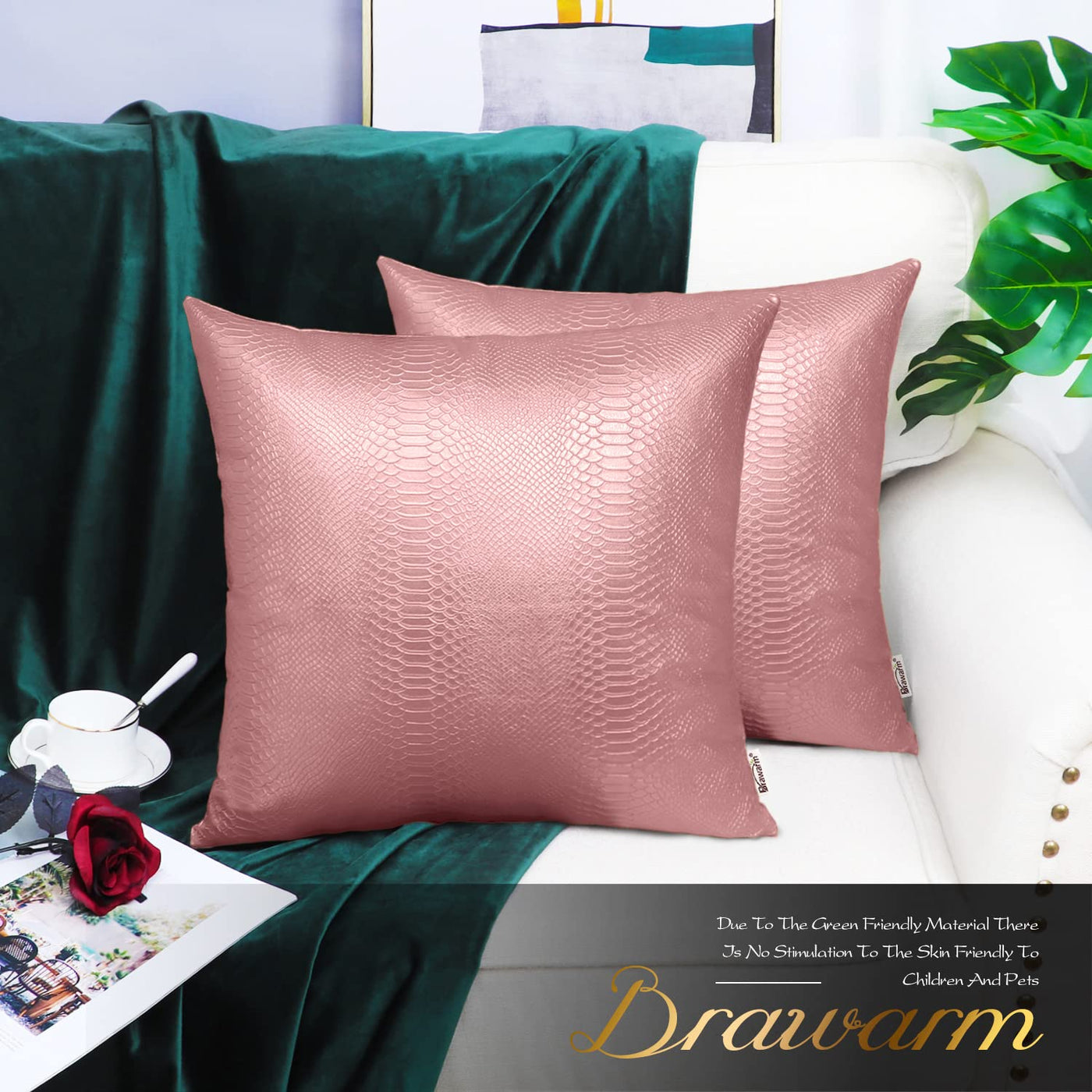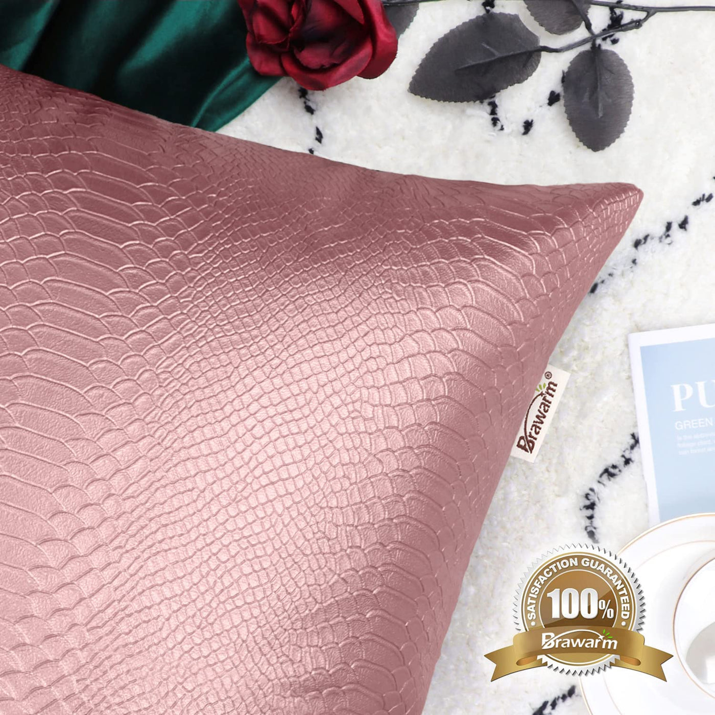 Q: What material are the BRAWARM Rose Gold Leather Throw Pillows made from?A: The BRAWARM Rose Gold Leather Throw Pillows are made from durable faux leather with a snake embossed design, offering a soft and cozy touch.