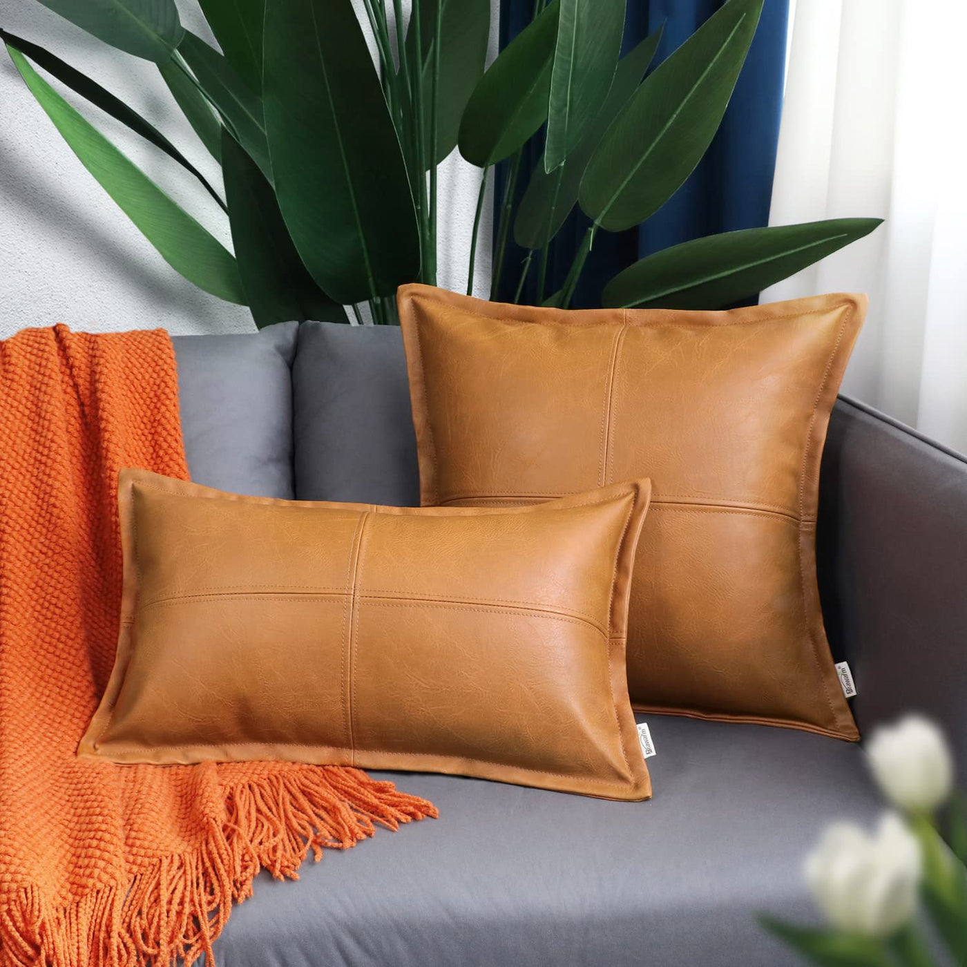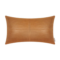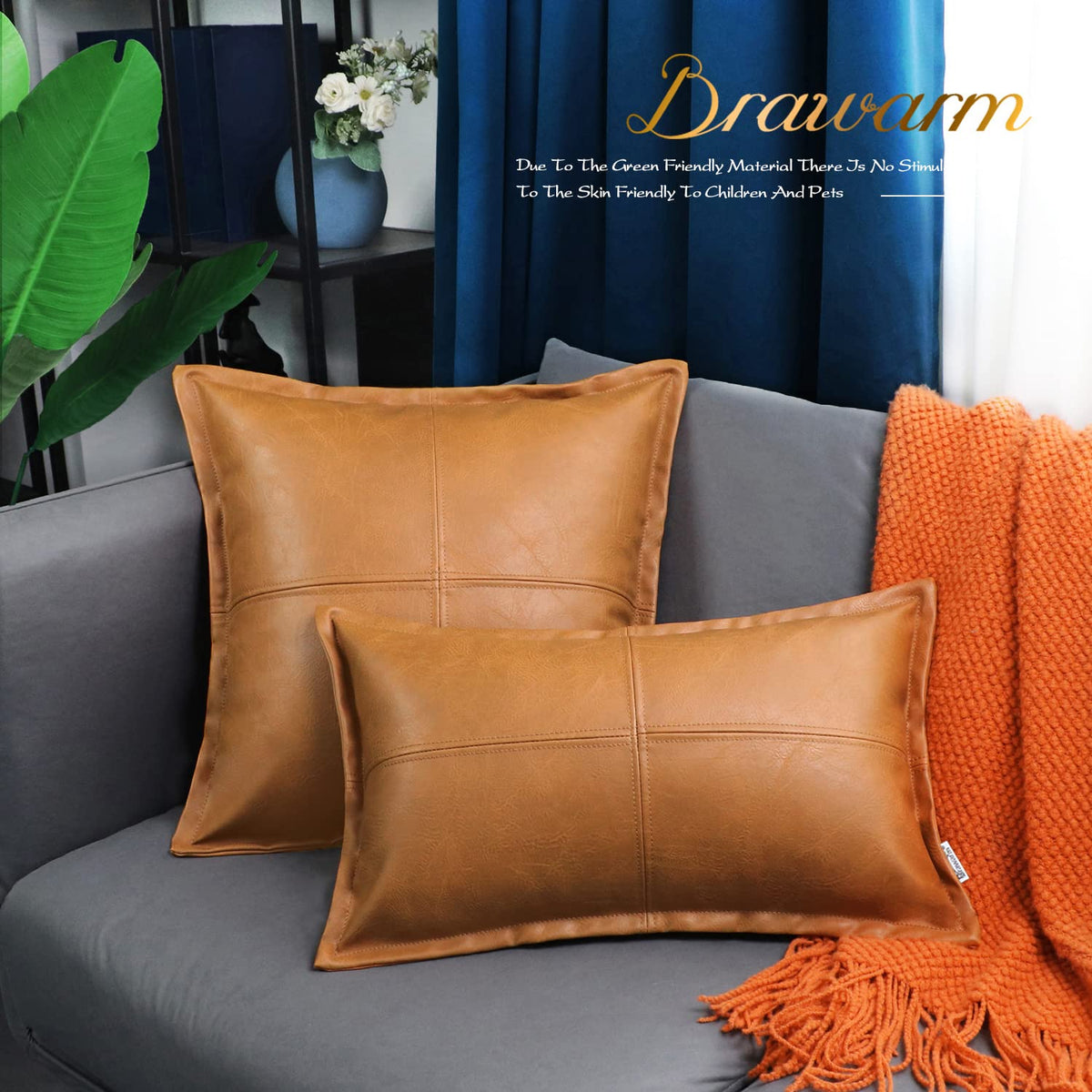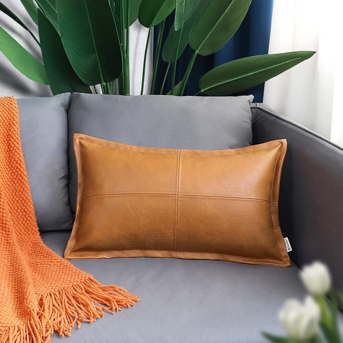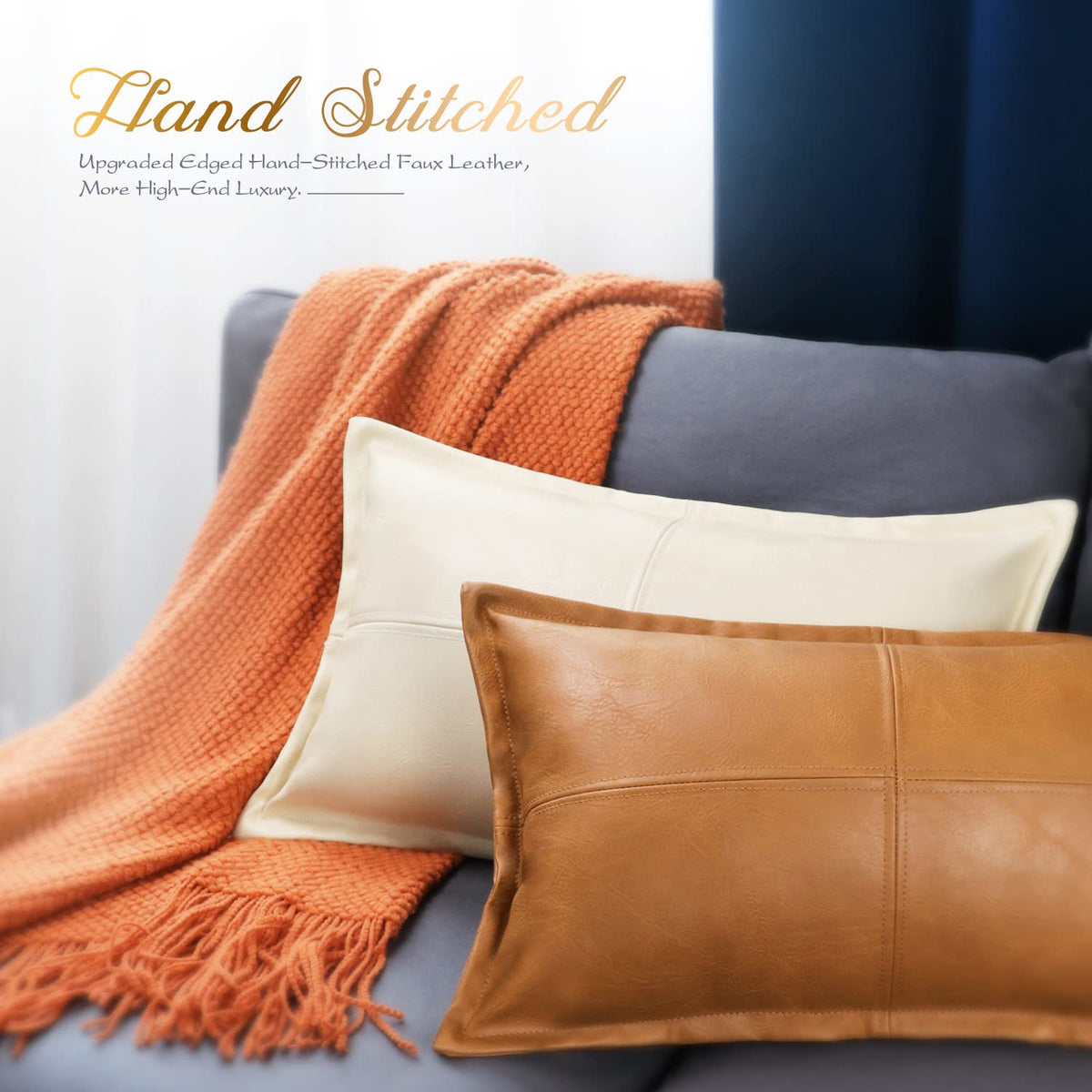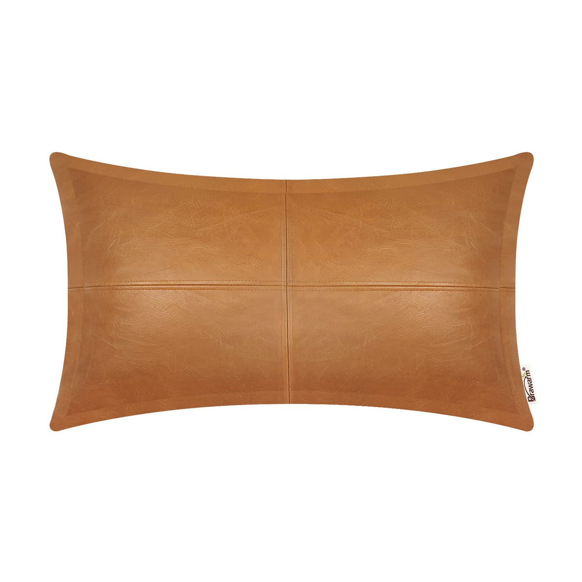 Brawarm Tan Leather Throw Pillow 12 X 20 Inches, Faux Leather Pillow Cover With Piping, Hand Stitched Leather Decorative Lumbar