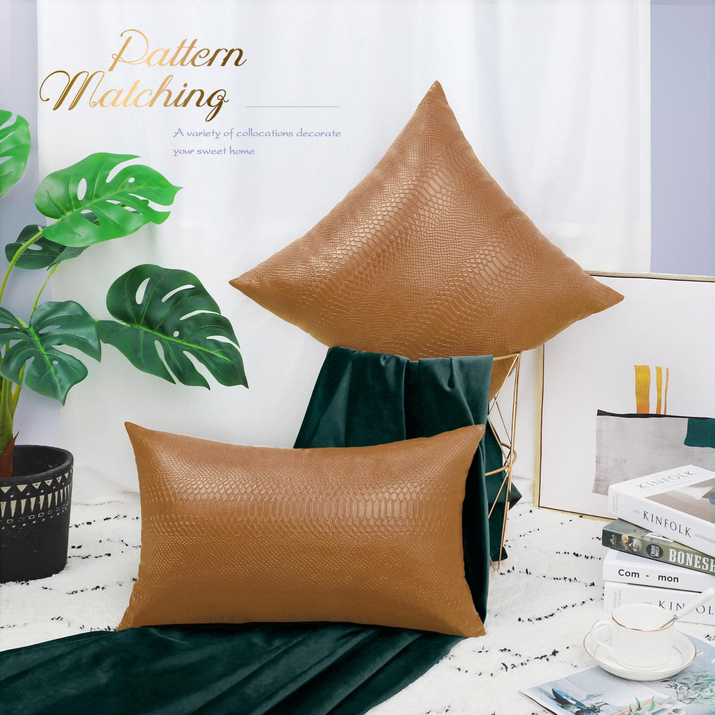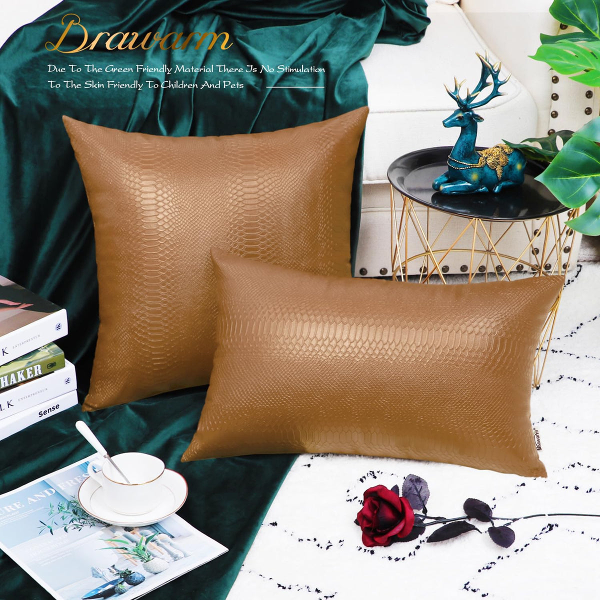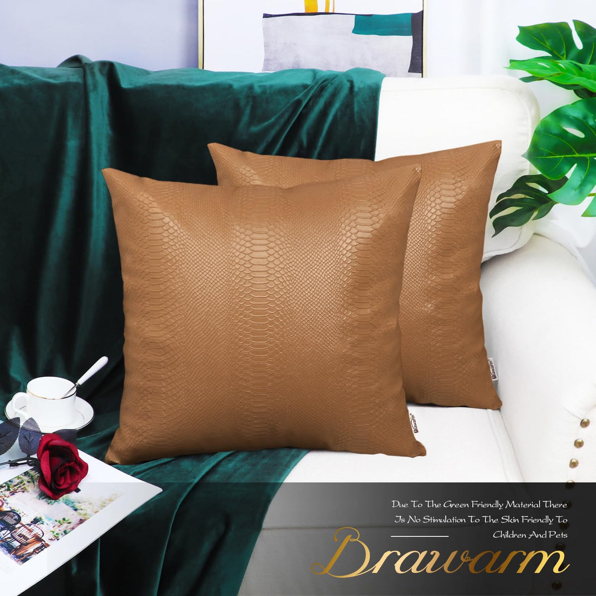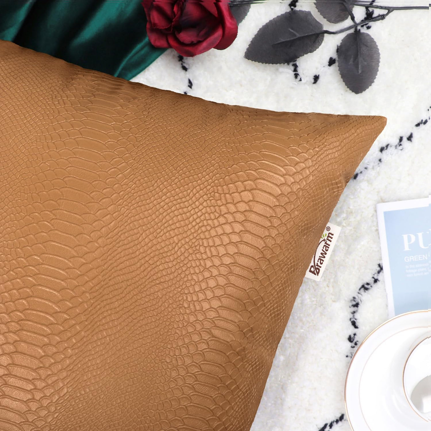 Brawarm Tan Leather Throw Pillows 22 X 22 Inches, Snake Leather Pillow Covers Pack Of 2, Faux Leather Decorative Pillow Covers F