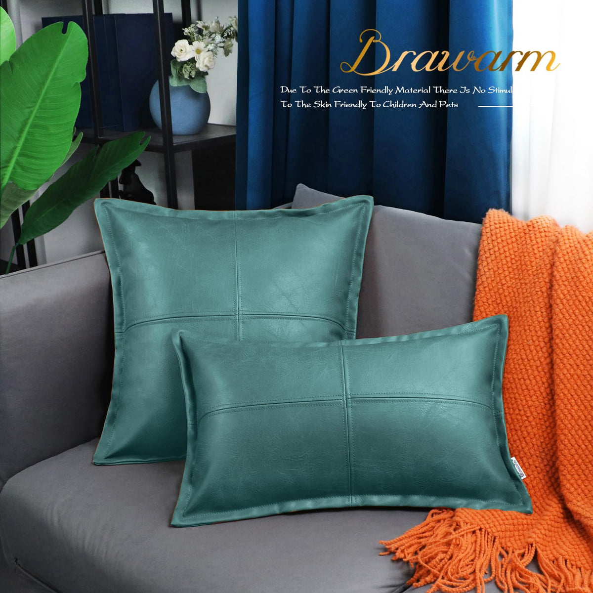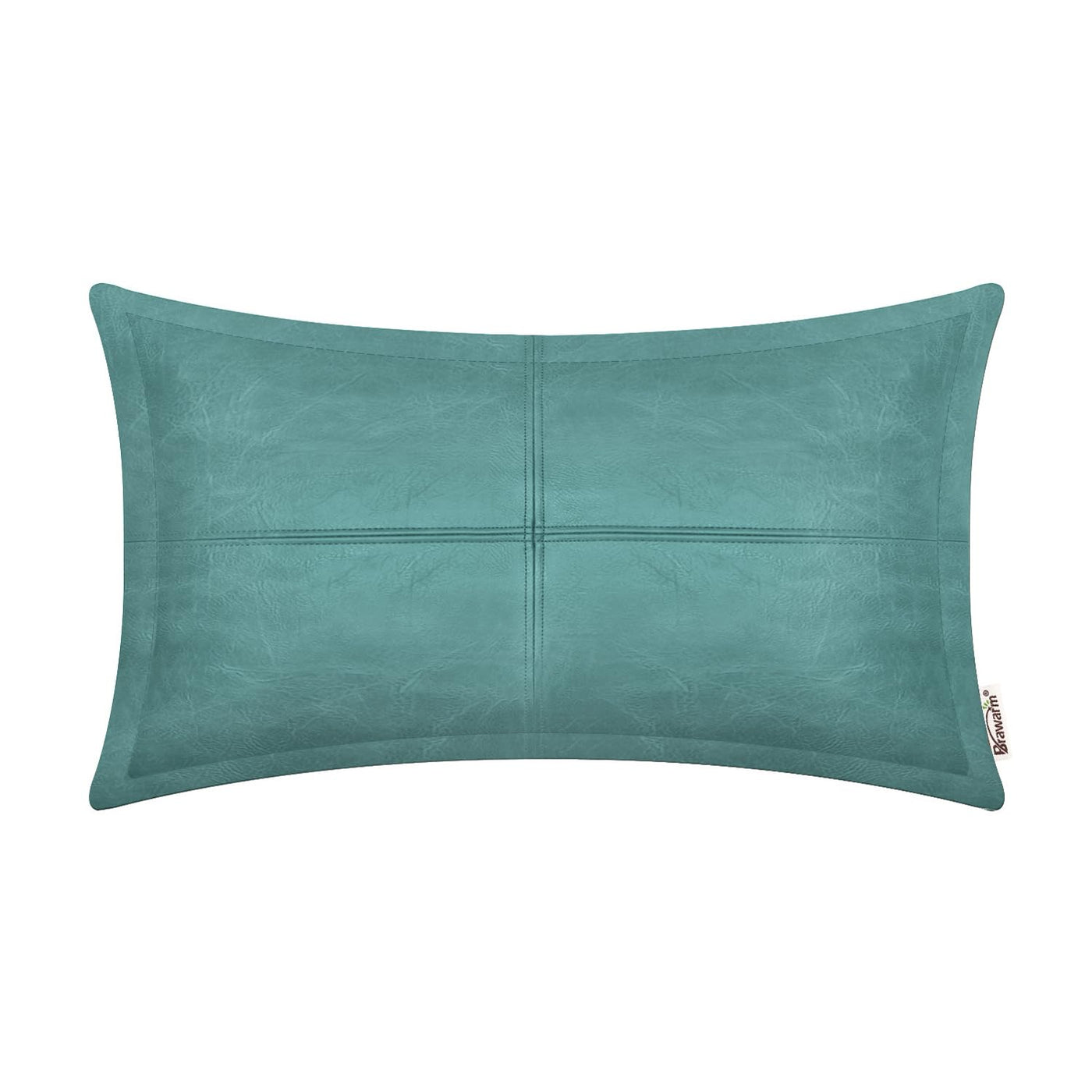Q: What are the dimensions of the BRAWARM Teal Leather Throw Pillow?A: The pillow cover measures 12 inches by 20 inches (30 x 50 cm), making it a perfect rectangular shape for lumbar support on couches, sofas, and beds.