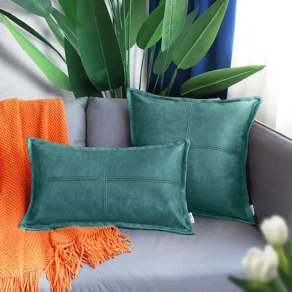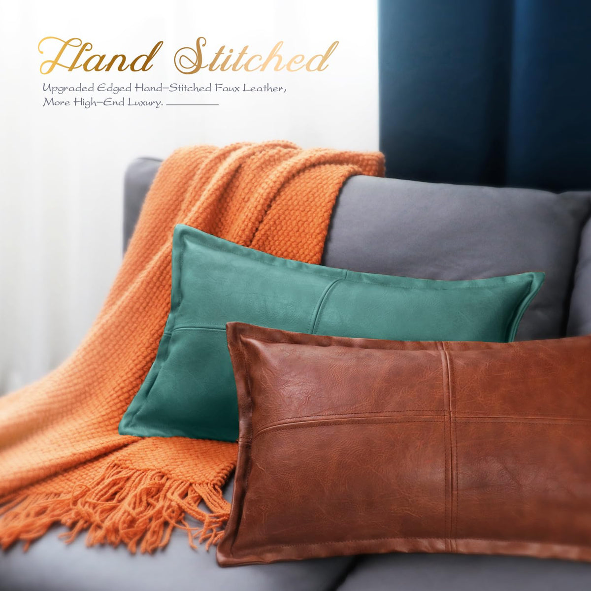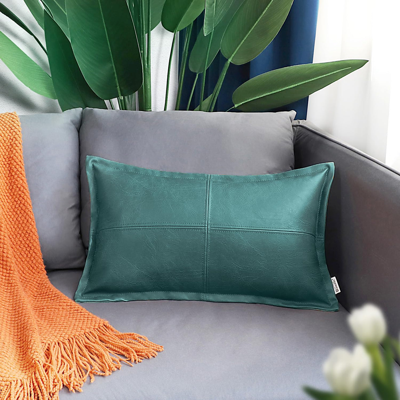 Brawarm Teal Leather Throw Pillow 12 X 20 Inches, Faux Leather Pillow Cover With Piping, Hand Stitched Leather Decorative Lumbar