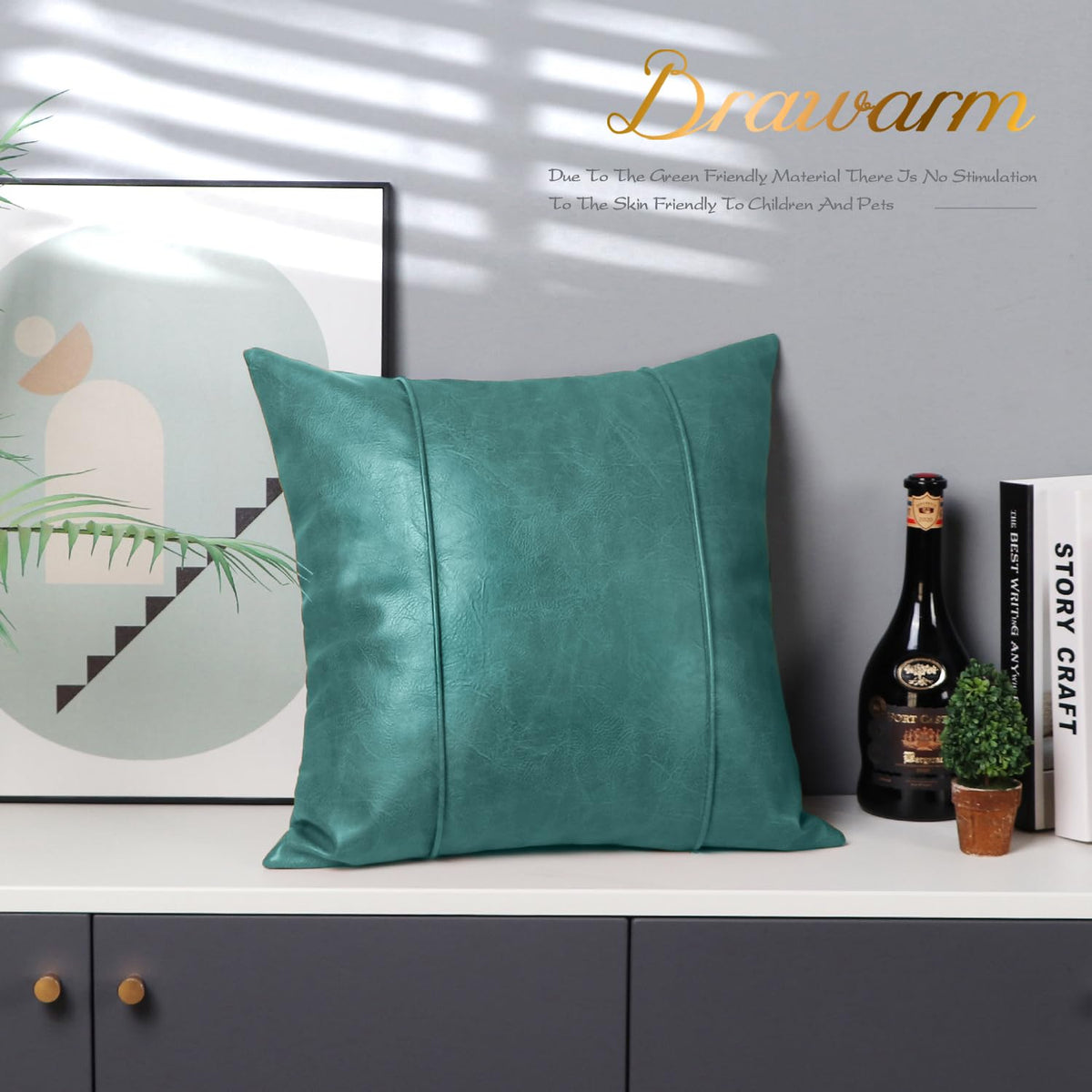 Q: What material is the BRAWARM Teal Leather Throw Pillow Cover made from?A: The BRAWARM Teal Leather Throw Pillow Cover is made from durable soft faux leather, featuring a piping design that enhances its aesthetic appeal and provides a cozy touch.