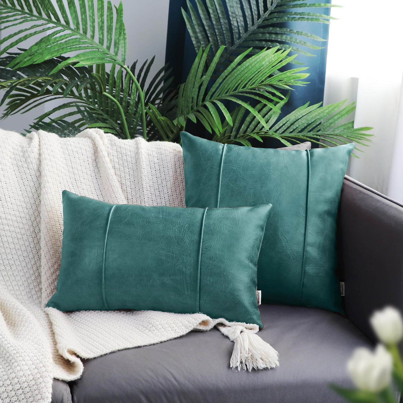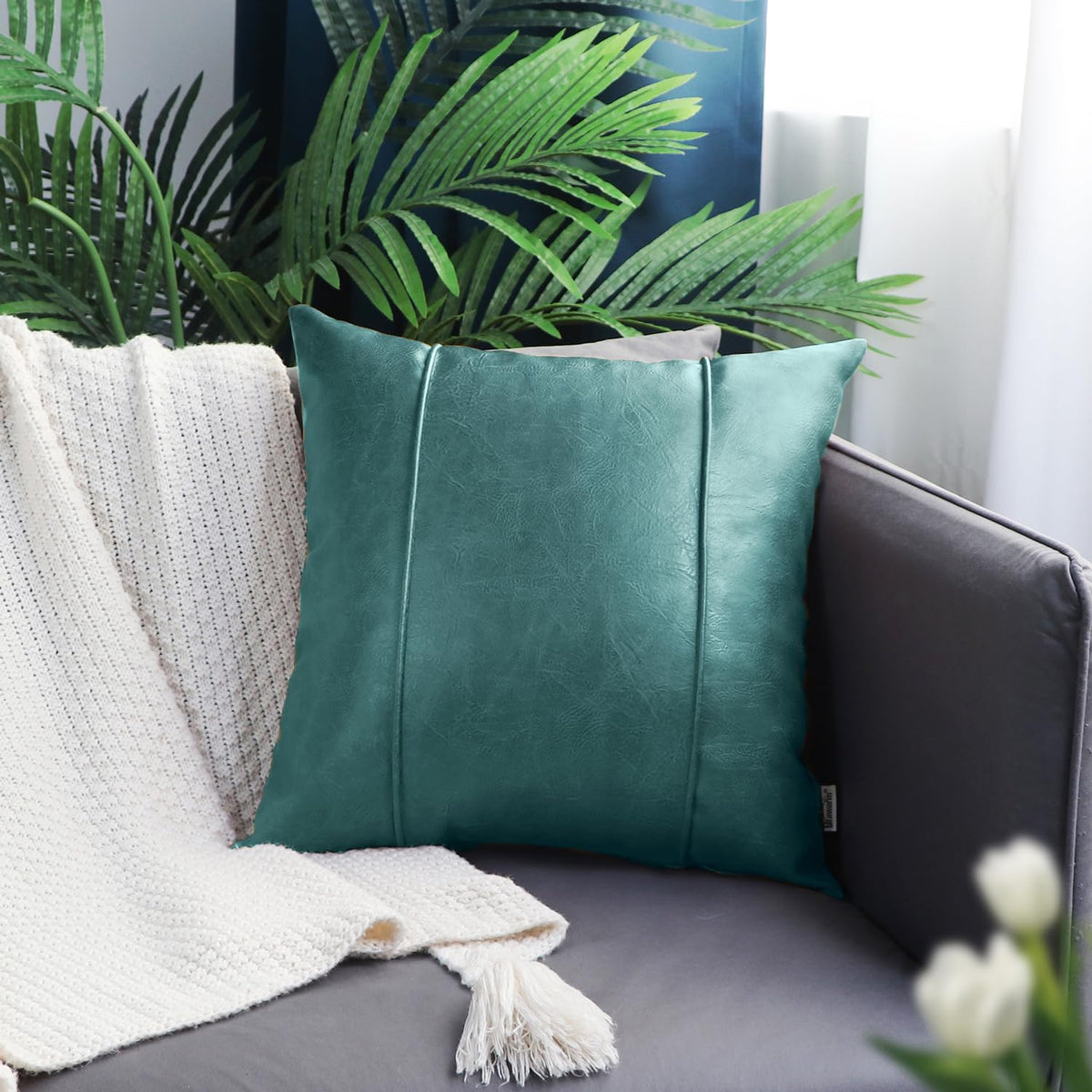 Brawarm Teal Leather Throw Pillow Covers 22 X 22 Inches - Faux Leather Pillow Cover With Piping, Hand Stitched Leather Throw Pil