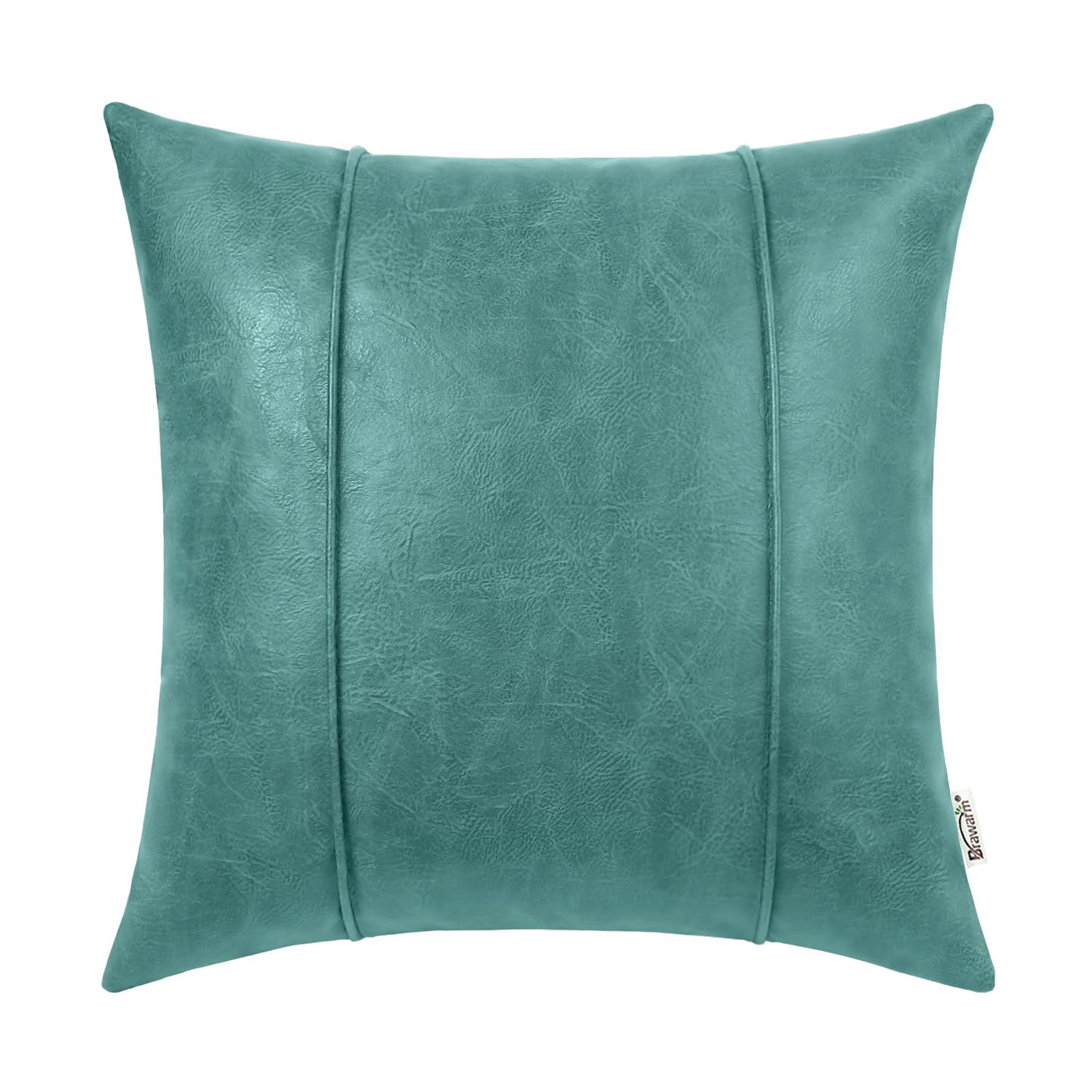 Q: What are the dimensions of the BRAWARM Teal Leather Throw Pillow Cover?A: The dimensions of the BRAWARM Teal Leather Throw Pillow Cover are 22 inches by 22 inches (55 cm x 55 cm), making it a perfect square for various decorative uses.