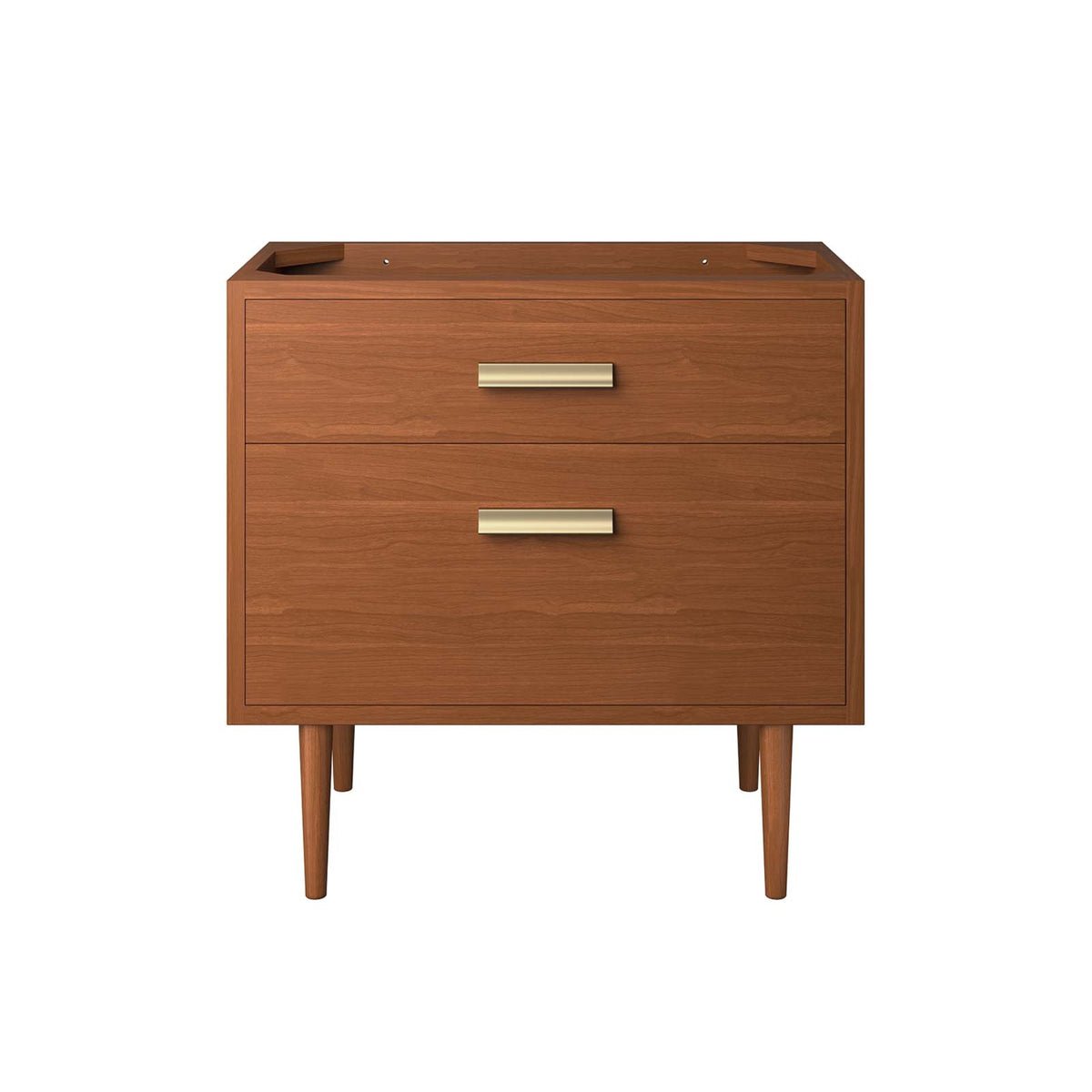 Bring mid-century inspiration and organic tropical aesthetics into any bathroom space with the Cassia 36'' Bathroom Vanity Cabinet. Featuring a clean-lined design and brass metal hardware, this vanity is durably crafted from solid teak wood with a faux top drawer for added interest. Raised off the ground by retro tapered legs, this bathroom vanity cabinet features ample storage in its spacious bottom drawer, complete with a convenient cut-out to accommodate plumbing. Includes non-marking foot caps. Assembly required. Sink basin and fixtures not included. Weight Capacity: 187 lbs.Set Includes:One - Cassia 36'' Bathroom Vanity Cabinet (Sink Basin Not Included)