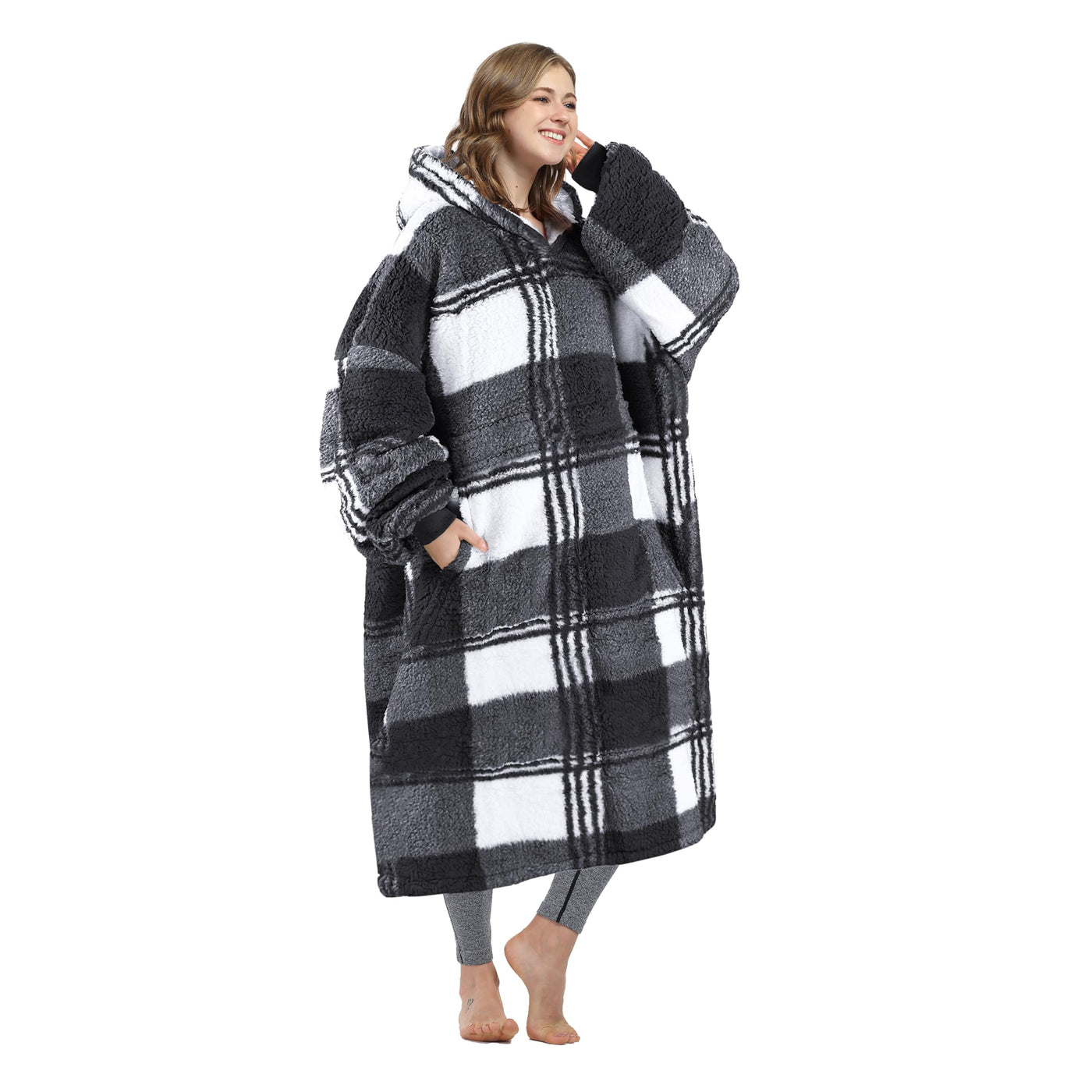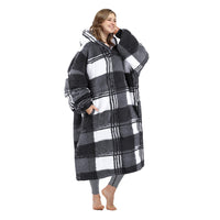 Catalonia Buffalo Plaid Black Oversized Blanket Hoodie Sweatshirt, Full Body Comfortable Sherpa Lounging Pullover For Adults, Gi