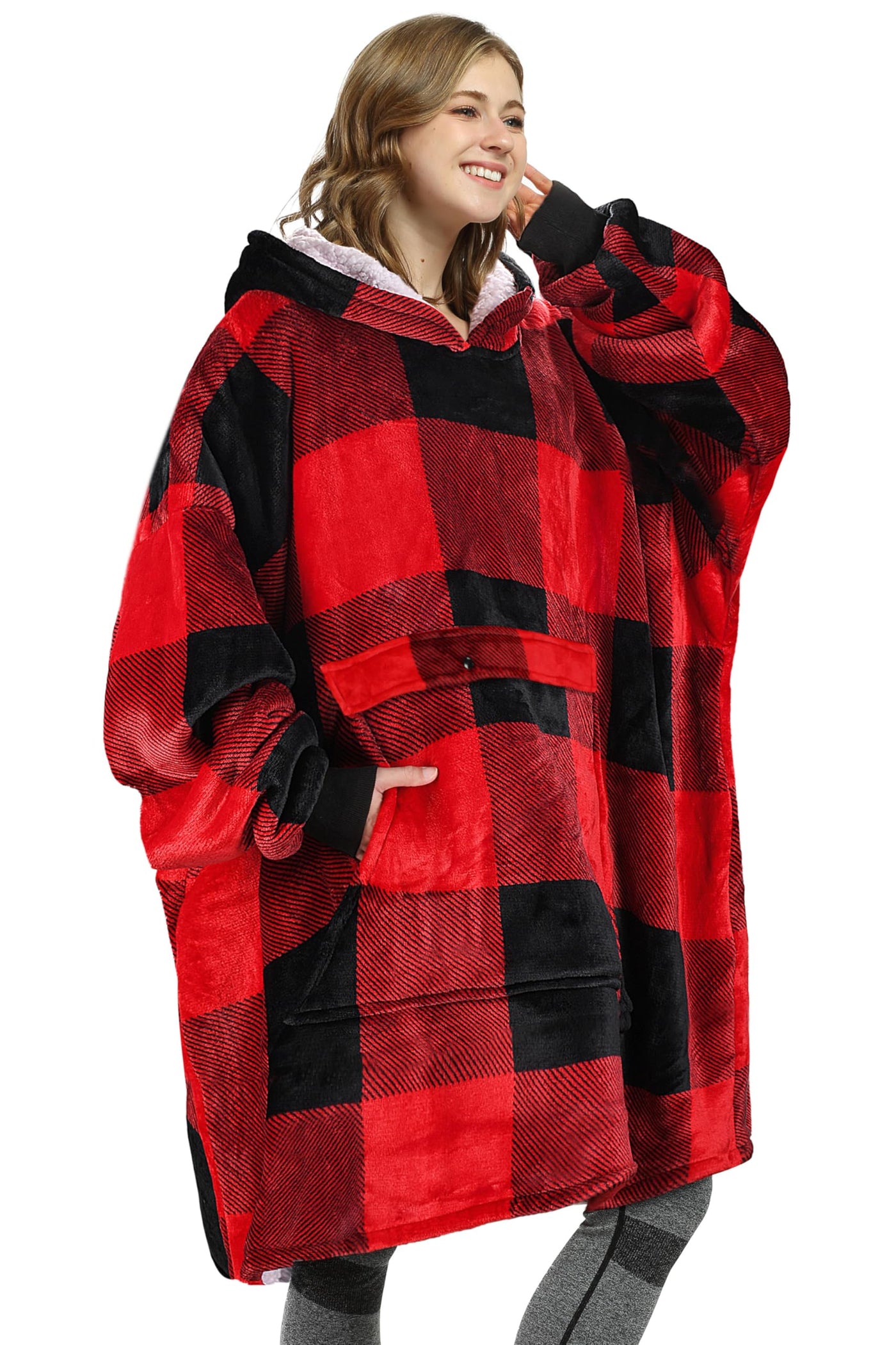 Catalonia Buffalo Plaid Oversized Blanket Hoodie Sweatshirt, Wearable Sherpa Lounging Pullover For Adults Men Women Teenagers Wi