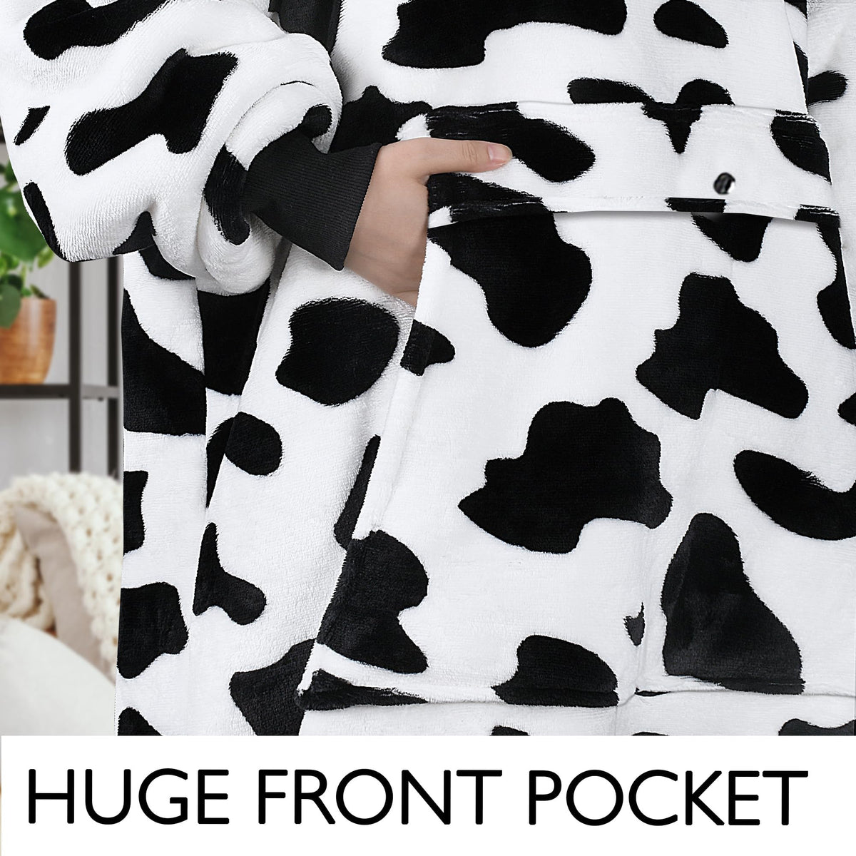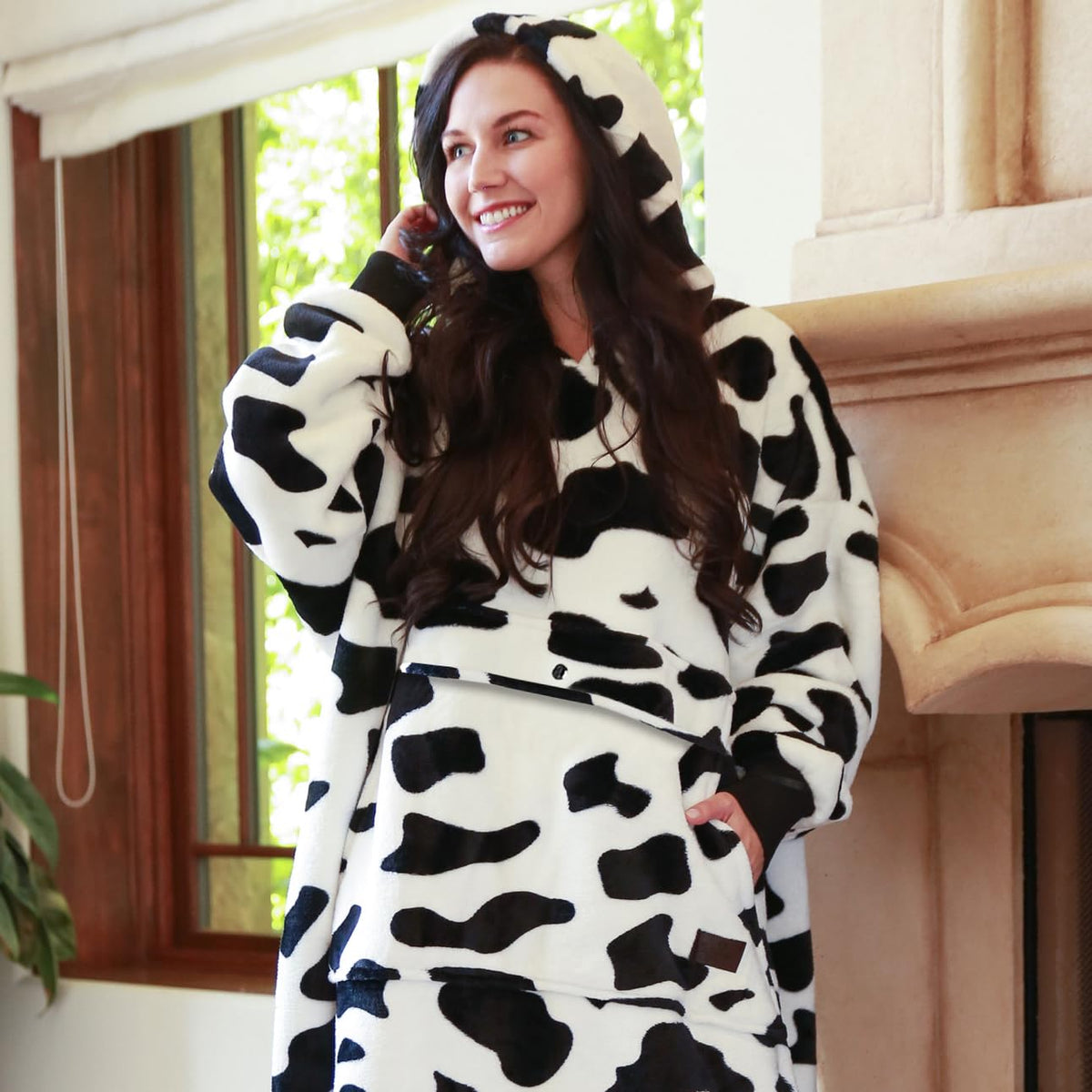 Q: Can I use this hoodie blanket for outdoor activities?A: While primarily designed for indoor lounging, the Catalonia Cow Print Oversized Hoodie Blanket Sweatshirt can also be worn outdoors for added warmth during casual outings.
