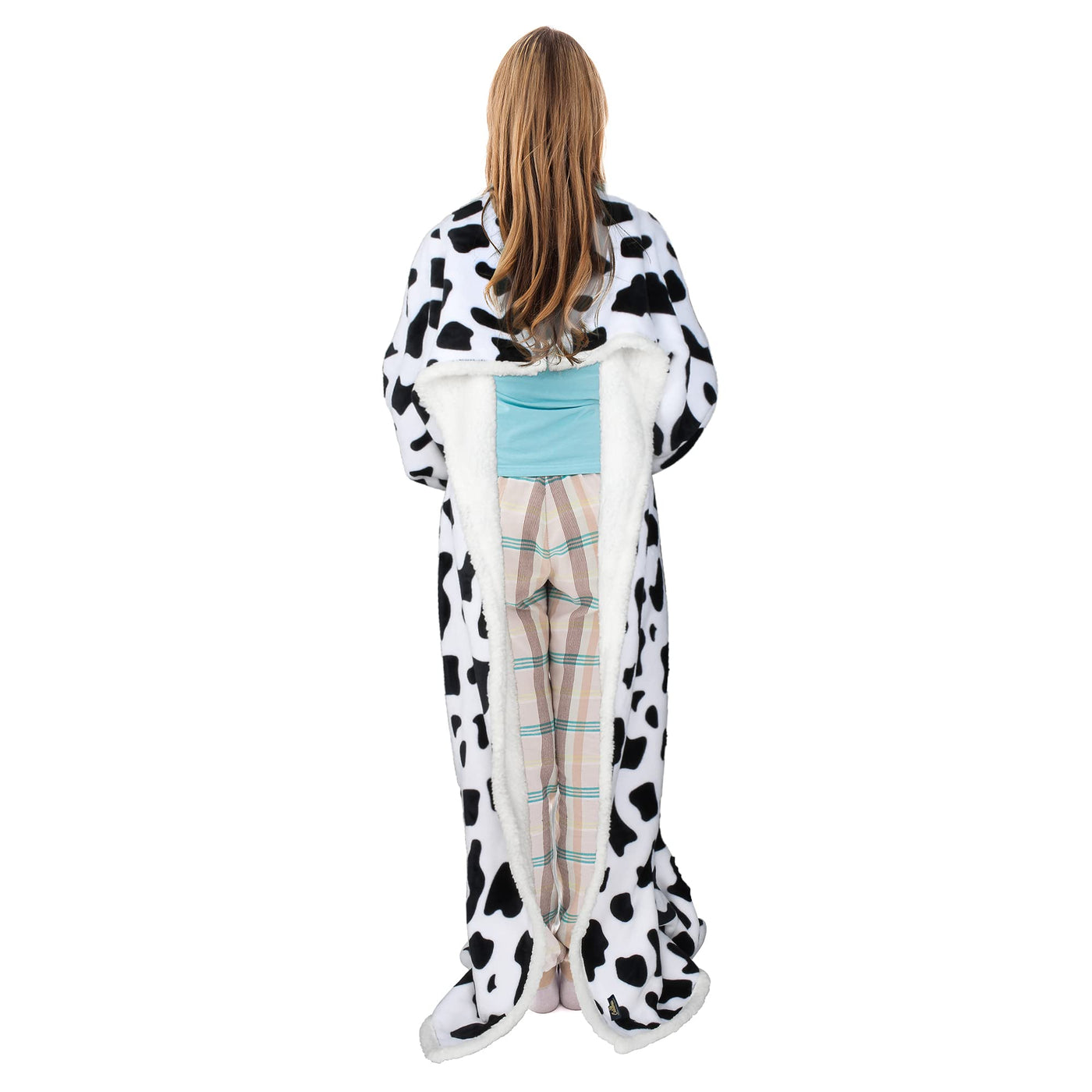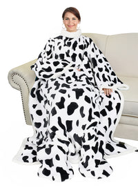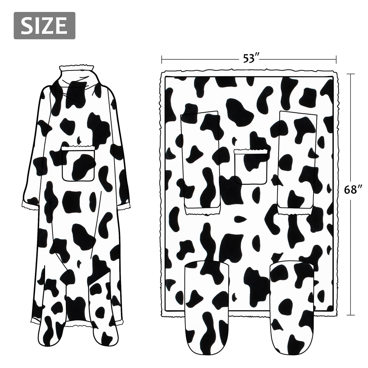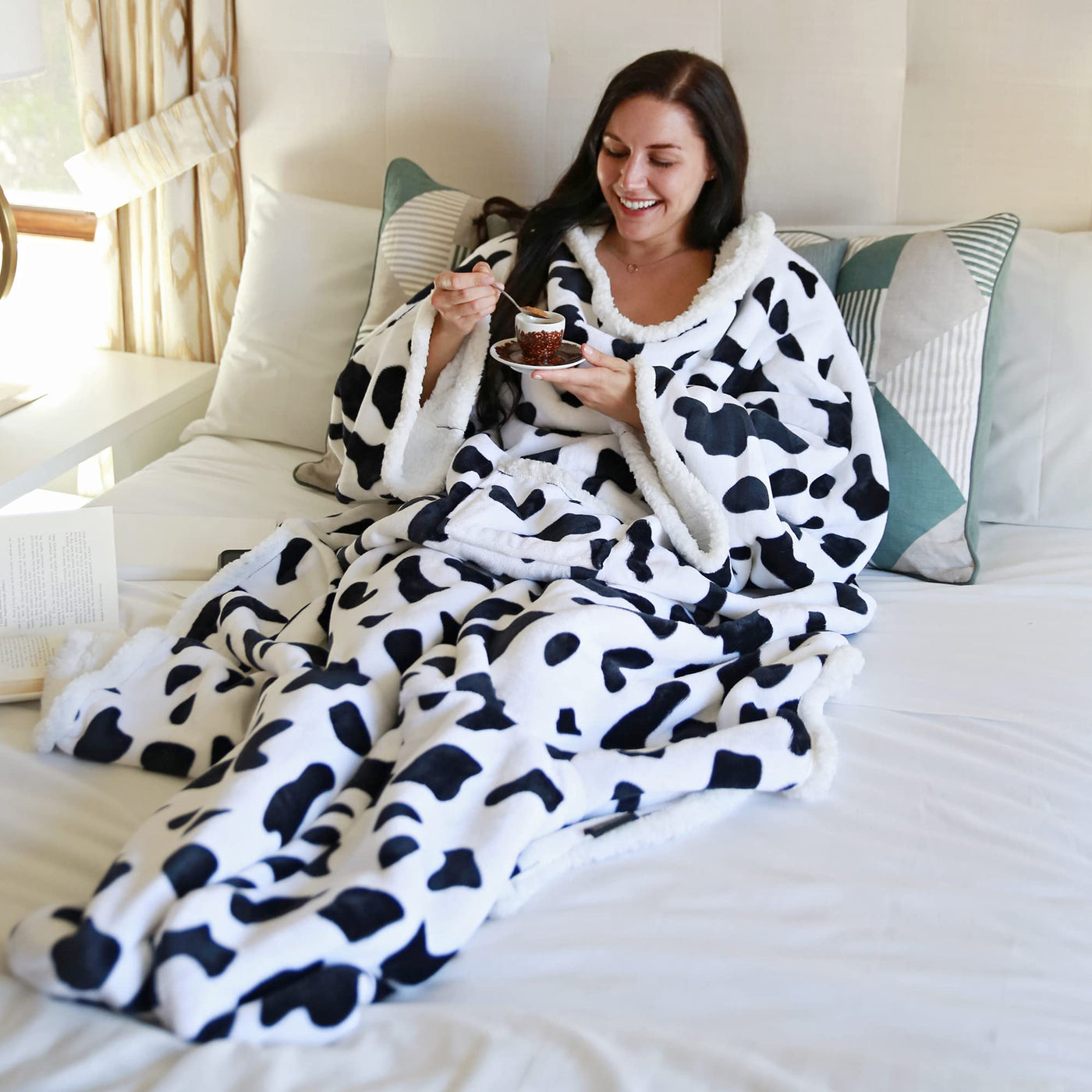 Catalonia Cow Print Sherpa Wearable Blanket With Sleeves & Foot Pockets For Adult Women Men, Comfy Snuggle Wrap Sleeved Throw Bl
