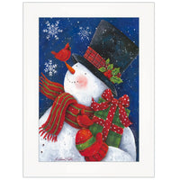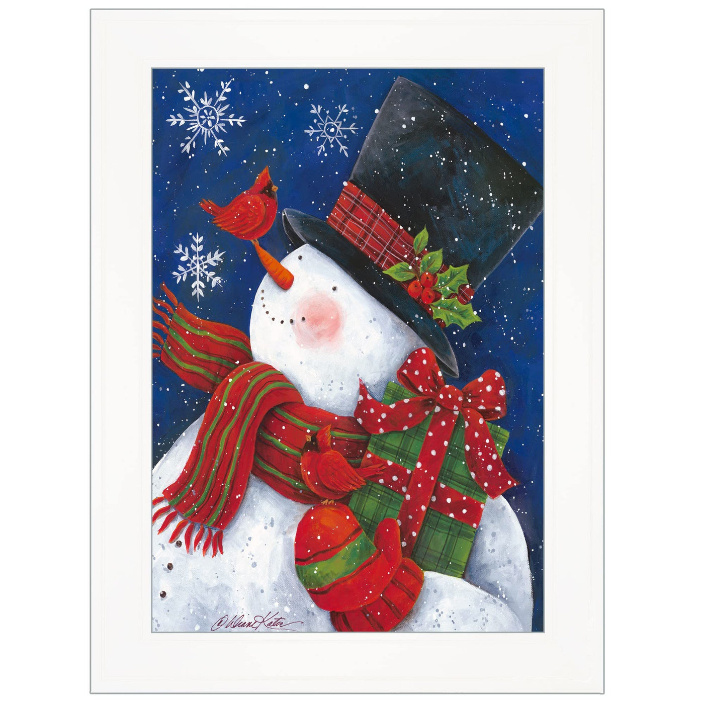 Add some Christmas cheer to your space with this cheery snowman with present white framed print wall art. This print is a visual artistic expression that allows you to decorate your space in Reproduced for you on paper, this hanging decorative accent will be a trendy and fashionable way to dress your walls. Hang on your wall to add some up to date fashion and decoration. Utilize this opportunity to create a focal point in the room with this wonderful wall decor option. H x 11' W x 1' D