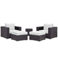 Experience different levels of sensitivity with the Convene Outdoor Sectional series. Crafted with a durable synthetic rattan weave and a sturdy powder-coated aluminum frame, Convene offers a versatile outdoor furniture set that can be easily rearranged to suit your spontaneous needs. Equipped with weather-resistant fabric cushions, this series not only leaves a lasting impression on your friends and family but also enhances the ambiance of your patio, backyard, or poolside gathering. This particular set is the Outdoor Patio Sectional Sofa Set, which includes one Convene Outdoor Patio Side Table Section, two Convene Outdoor Patio Armchair Sections, and two Convene Outdoor Patio Ottoman Sections.
