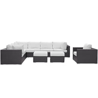 Experience different levels of sensitivity with the Convene Outdoor Sectional series. Crafted with a durable synthetic rattan weave and a powder-coated aluminum frame, Convene offers a versatile outdoor furniture set that can be easily rearranged to meet your spontaneous needs. Equipped with weather-resistant fabric cushions, this series not only leaves a positive impression on your friends and family but also enhances the ambiance of your patio, backyard, or poolside gathering. This particular set is the Outdoor Patio Sectional Sofa Set, which includes one Convene Outdoor Patio Armchair Section, three Convene Outdoor Patio Armless Sections, three Convene Outdoor Patio Corner Sections, and two Convene Outdoor Patio Ottomans.