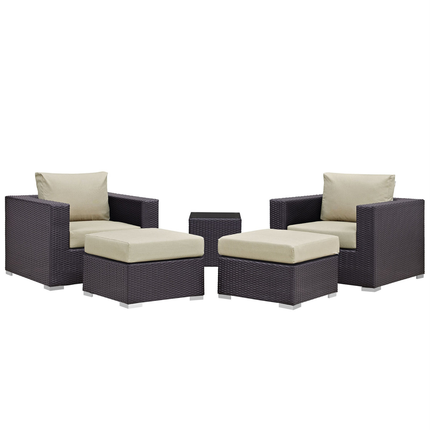 Experience different levels of sensitivity with the Convene Outdoor Sectional series. Crafted with a synthetic rattan weave and a powder-coated aluminum frame, the Convene Patio Lounge Armchair and Ottoman set is a versatile outdoor collection that can be easily rearranged to meet your spontaneous needs. Equipped with all-weather fabric cushions, this deck chair will impress your friends and family while adding a touch of elegance to your patio, backyard, or poolside gathering. This particular set is the Outdoor Patio Sectional Sofa Set, which includes one Convene Outdoor Patio Side Table Section, two Convene Outdoor Patio Armchair Sections, and two Convene Outdoor Patio Ottoman Sections.