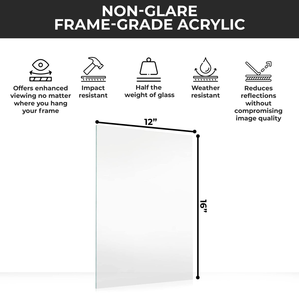 Q: Is the CountryArtHouse non-glare acrylic compatible with all 12x16 picture frames?A: Yes, the CountryArtHouse non-glare acrylic is specifically designed to fit standard 12x16 picture frames, making it a versatile replacement option for your existing frames.