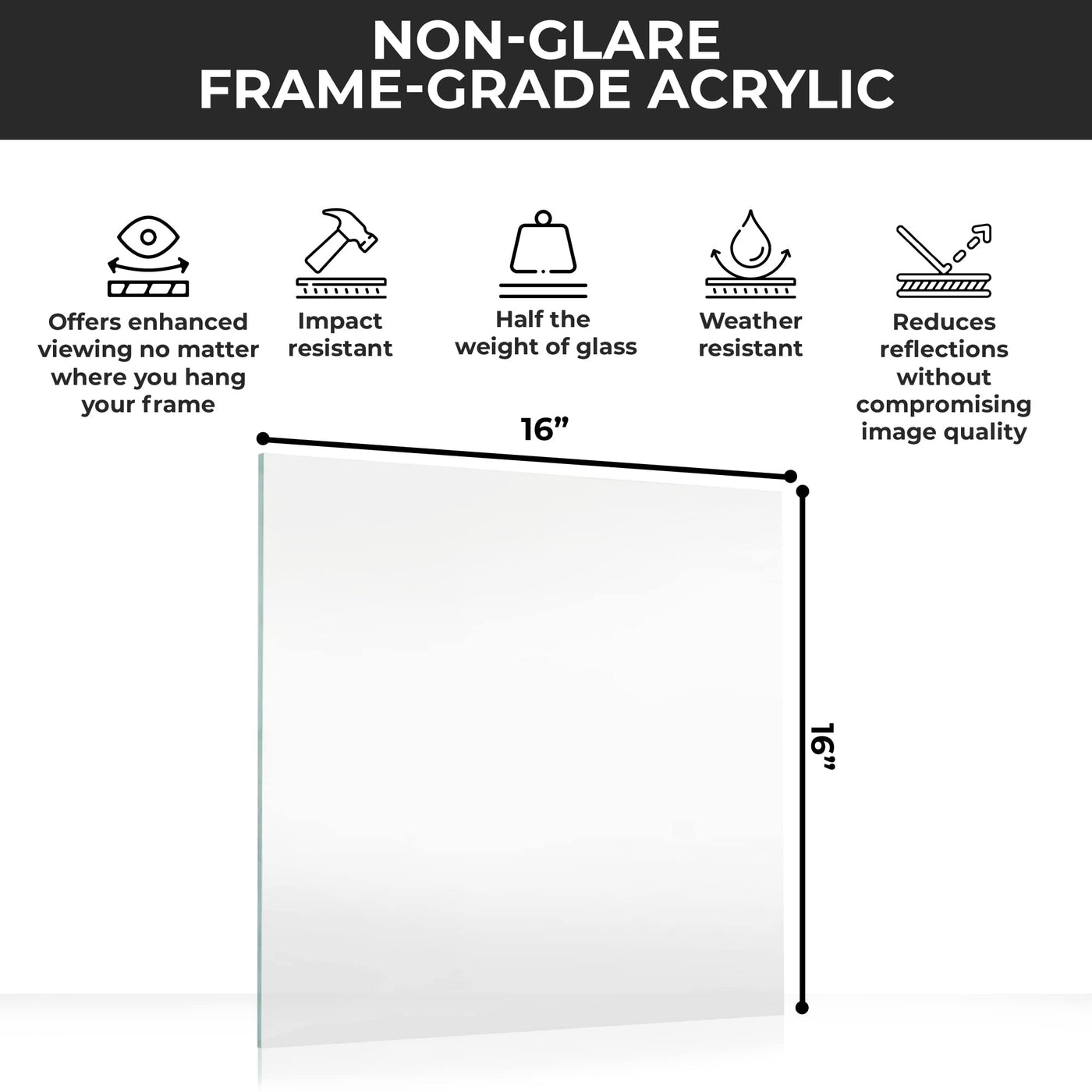 Q: Is this acrylic replacement compatible with all 16x16 picture frames?A: Yes, this non-glare acrylic replacement is specifically cut to fit standard 16x16 picture frames, ensuring compatibility with most frames of that size.