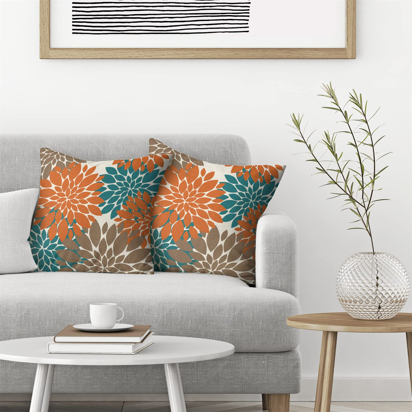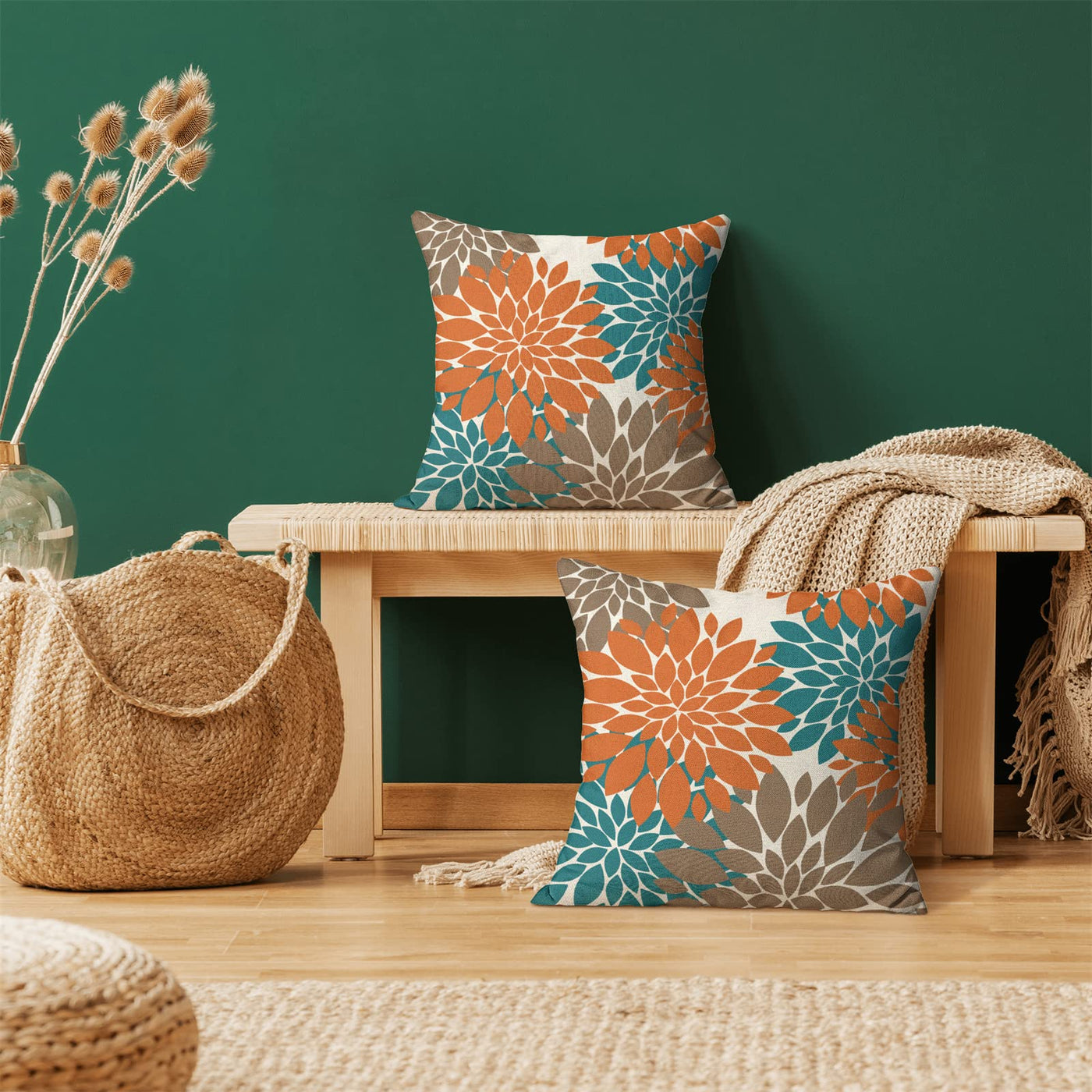 Cxmeifly Burnt Orange Brown Teal Pillow Covers 20X20 Inch Set Of 2 Dahlia Floral Decor Throw Pillows Summer Modern Geometry Flow