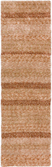 One word describes Joplin? soft The perfect combination of tonal textures for the casual lifestyle.FeaturesCut PileVarigated Yarns For Added DimensionSoothing & Silky FeelingHand FinishedDense & PlushCare Instructions: Vacuum regularly with straight suction vacuum. Never use a beater bar vacuum on a shag rug. Spot clean with mild soap and water. Never pull loose rug yarns; always trim with scissors.Package Type: RolledStyle: TransitionalConstruction: Tufted ShagFiber Content: 100% MicrofiberShape: RunnerColor: Copper, Gold, Ivory, TanBacking Type: CanvasPile Height: 0.98Product Size: 2'6" x 10'Made In China