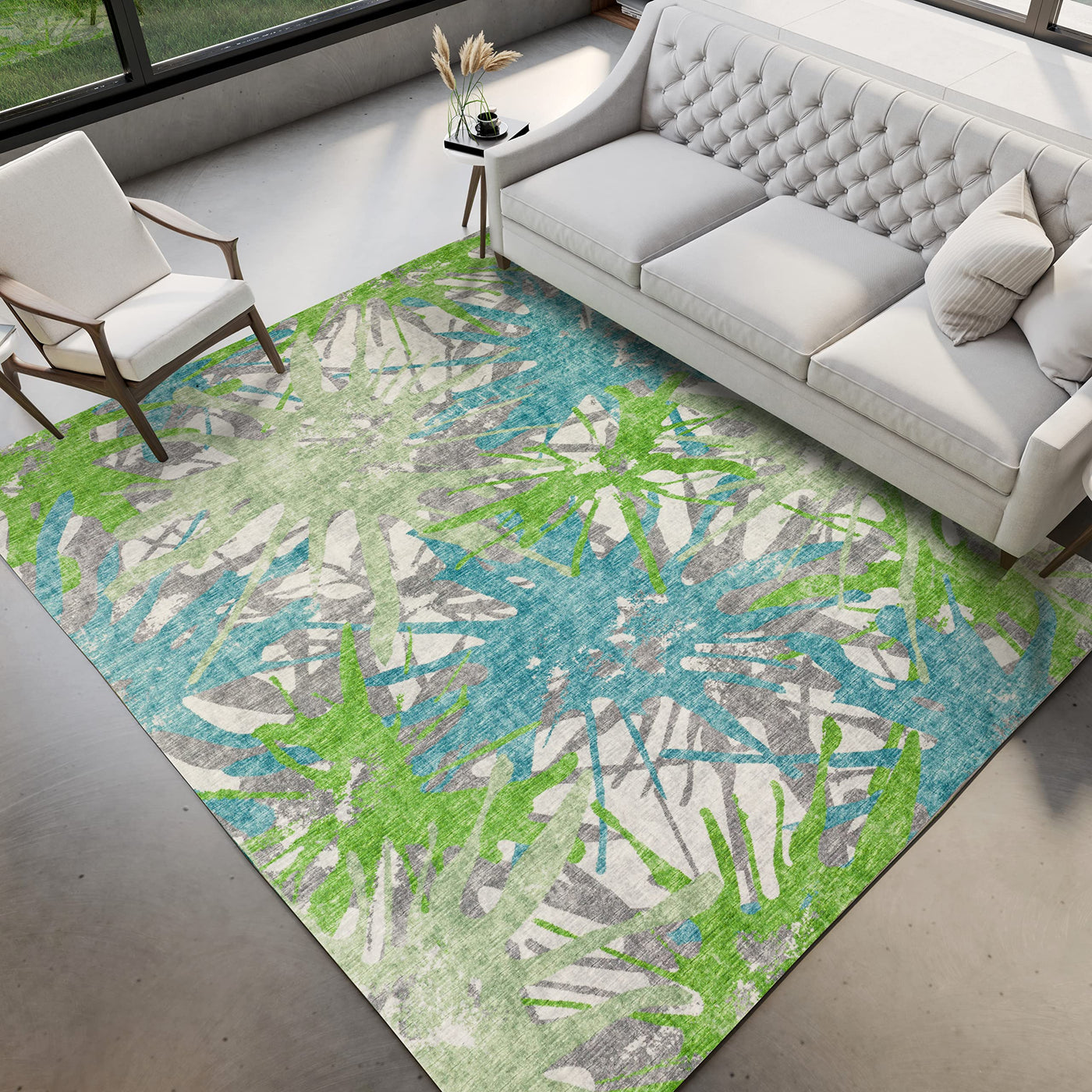 Q: Can the Mary's Isle rug be used in damp areas like bathrooms?A: Yes, the Mary's Isle rug can be used in damp spaces such as bathrooms, basements, and kitchens without worry, due to its moisture-resistant material.