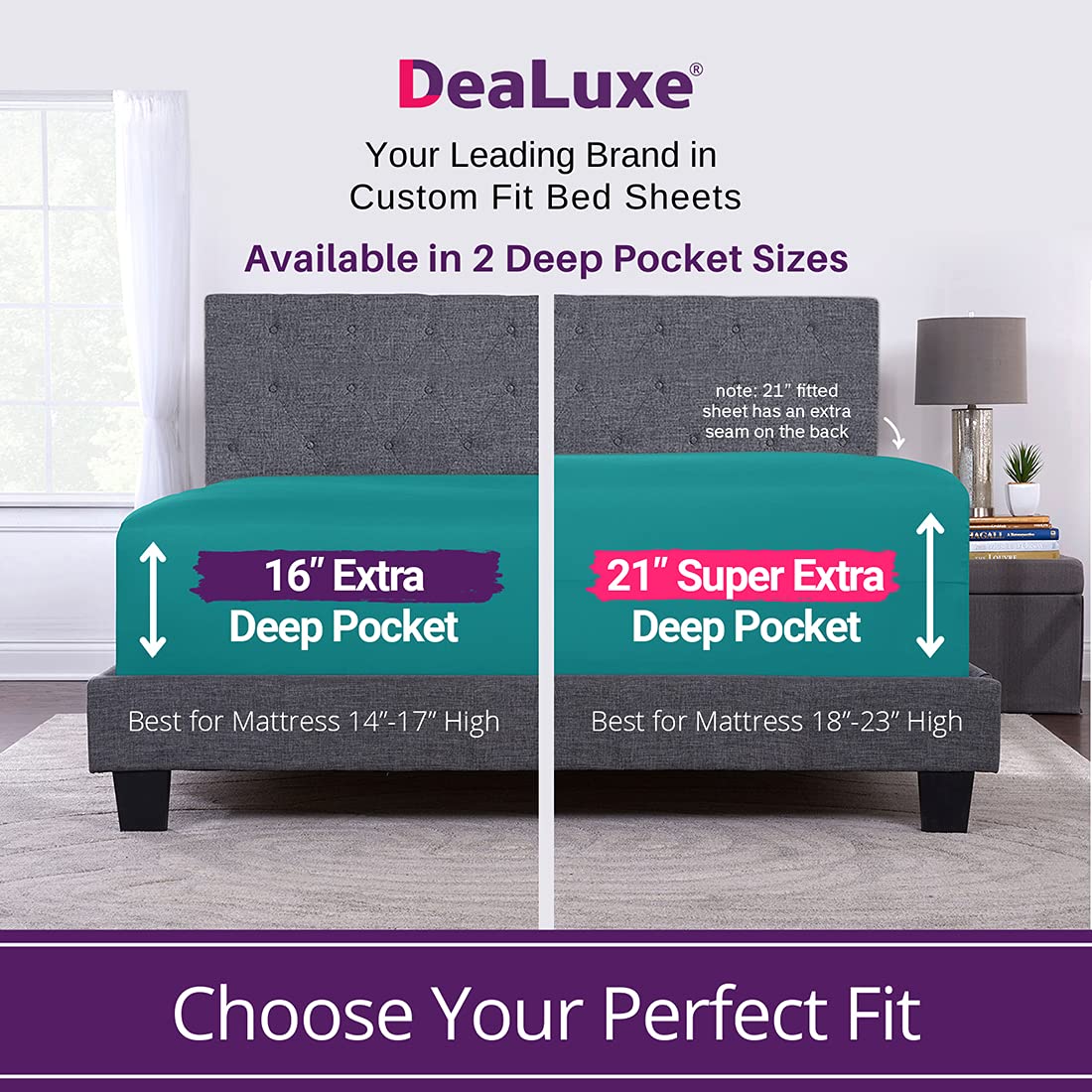 Q: Can the DeaLuxe 21" Sheet Set fit standard twin mattresses?A: Yes, the DeaLuxe 21" Sheet Set is designed for twin size mattresses, specifically accommodating those with a height of up to 21". It is perfect for standard twin mattresses and provides additional coverage for thicker models.