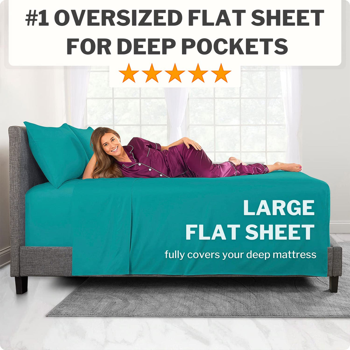 Q: What makes the DeaLuxe 21" Sheet Set suitable for high-profile mattresses?A: The DeaLuxe 21" Sheet Set features real super oversized flat sheets and deep pocket fitted sheets designed specifically for mattresses ranging from 18" to 23" in height. This ensures a snug fit without the risk of slipping off, making it ideal for high-profile pillow-top mattresses.