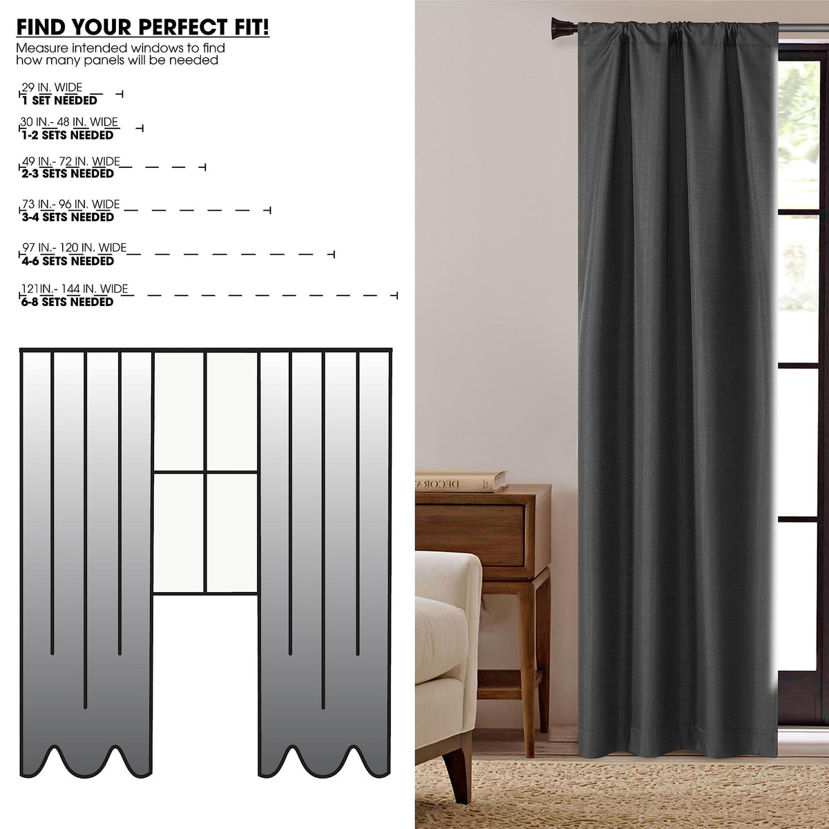 Q: What are the dimensions of the Dearfoams blackout curtain panels?A: The Dearfoams blackout curtain panels are sold as a set of two, with each panel measuring 37 inches wide and available in lengths of 63, 84, or 95 inches.