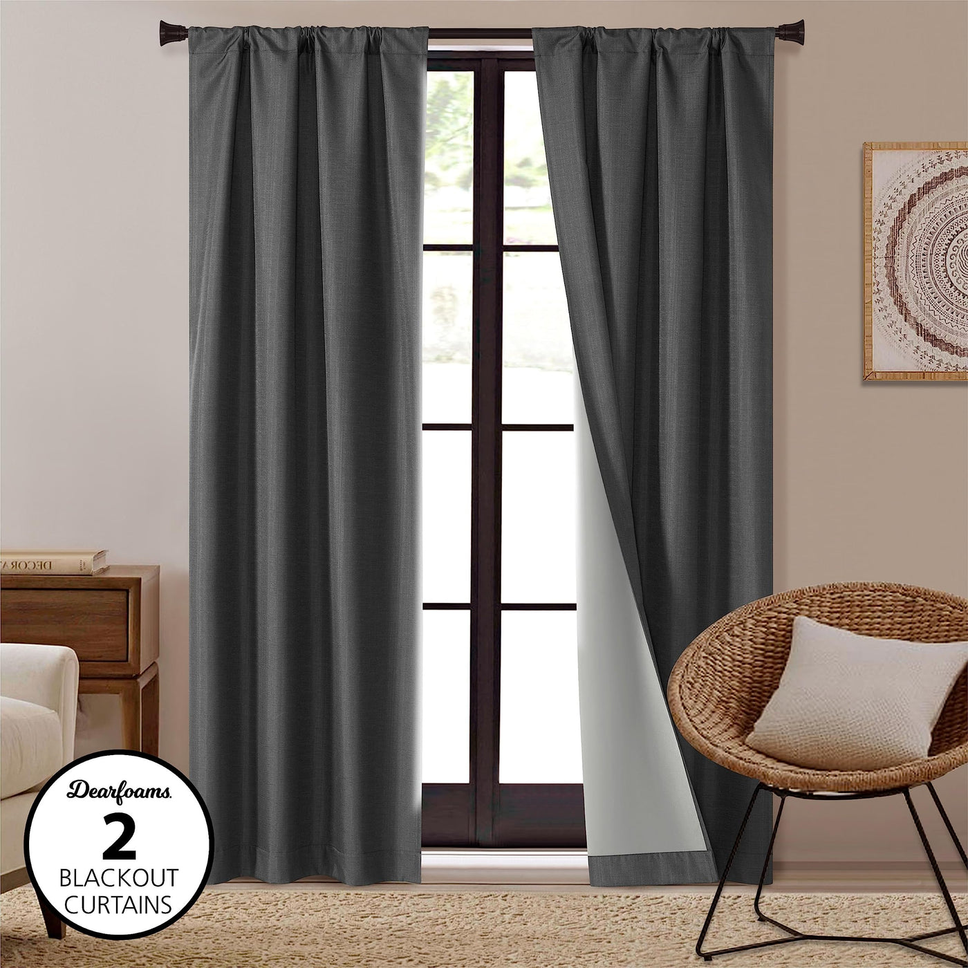 Q: What material are the Dearfoams blackout curtains made from?A: The curtains are made from 100% polyester, featuring a soft textured hand that adds elegance and durability, ensuring they look fresh even after years of use.