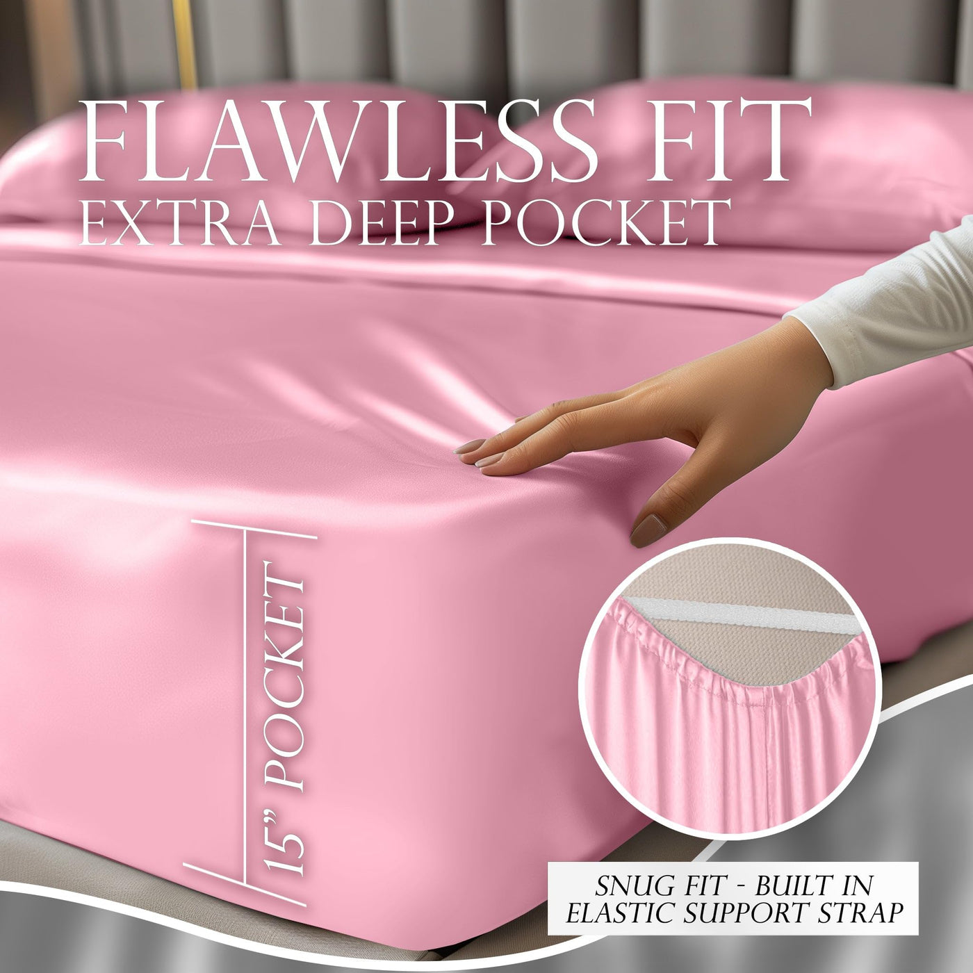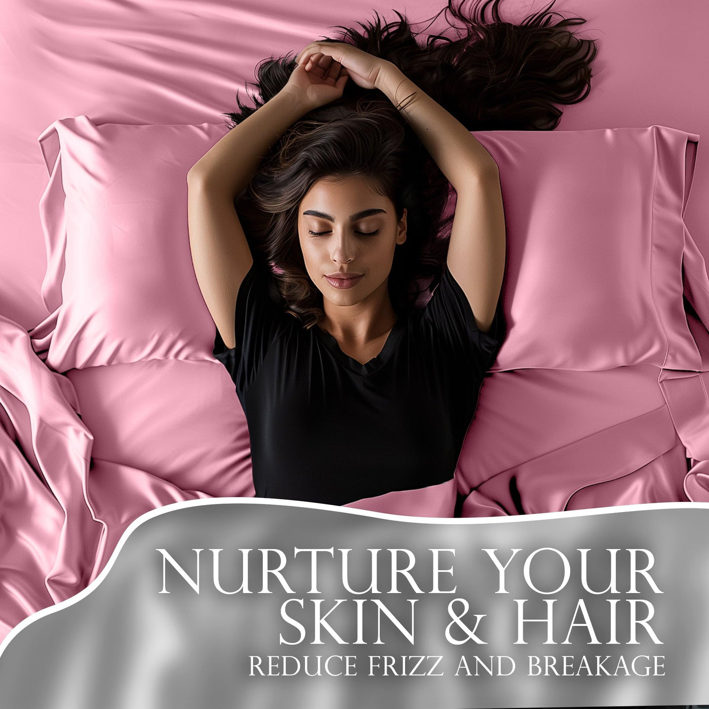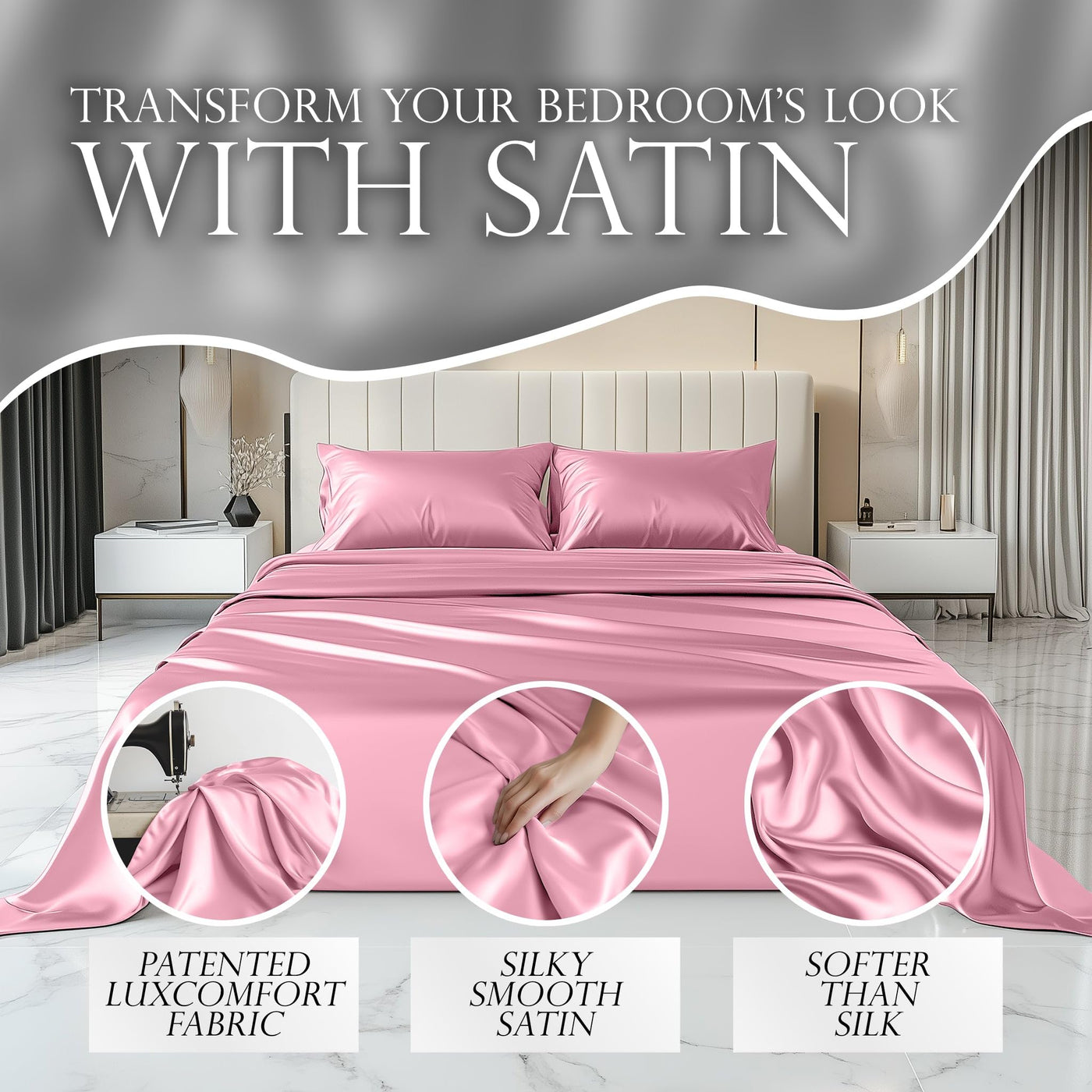 Decolure Satin Bed Linen Set, King, Pink, 6Pcs - Silky Soft, Luxurious, All-Season Sheets With Deep Pocket, Wrinkle-Free, Hypoal