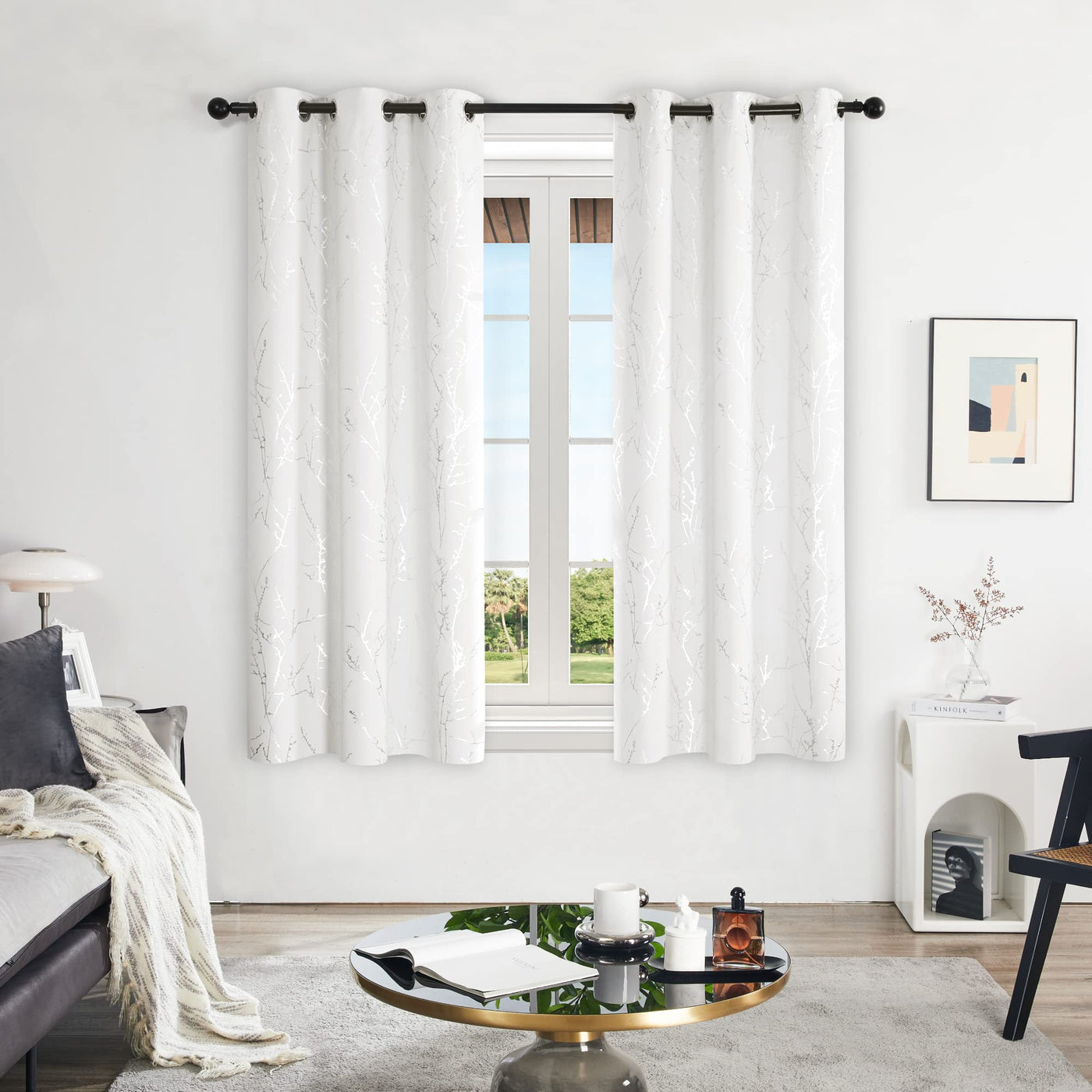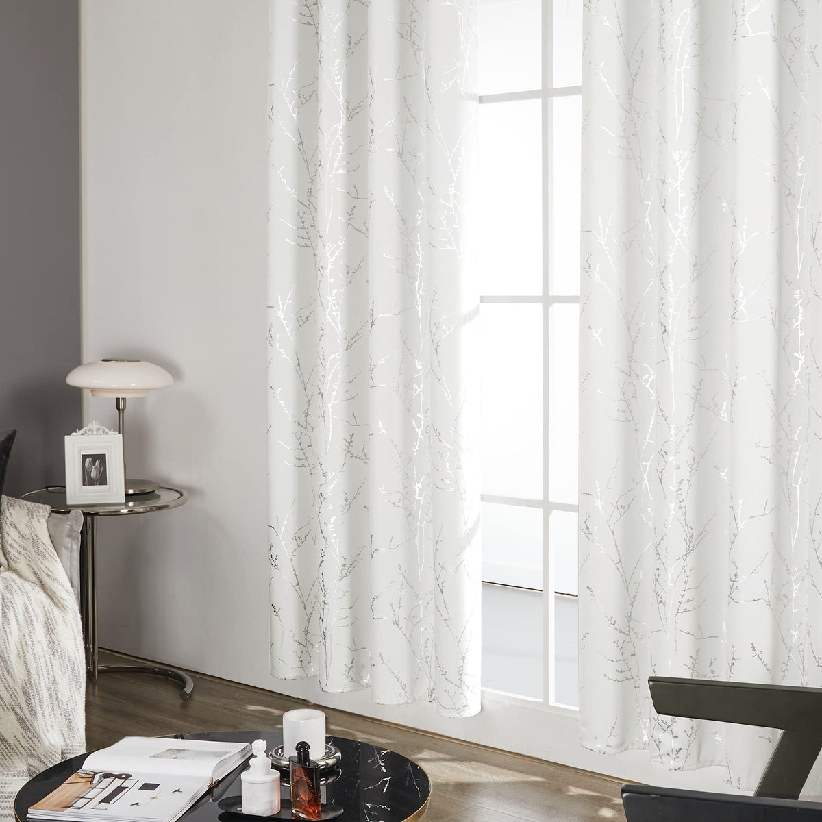 Deconovo Blackout Curtains - Silver Blossoming Branch Print, Thermal Insulated, Noise Reducing, Privacy Drapes For Bedroom & Living Room (42W X 63L Inch, White/Silver Tree Branch, 2 Panels)