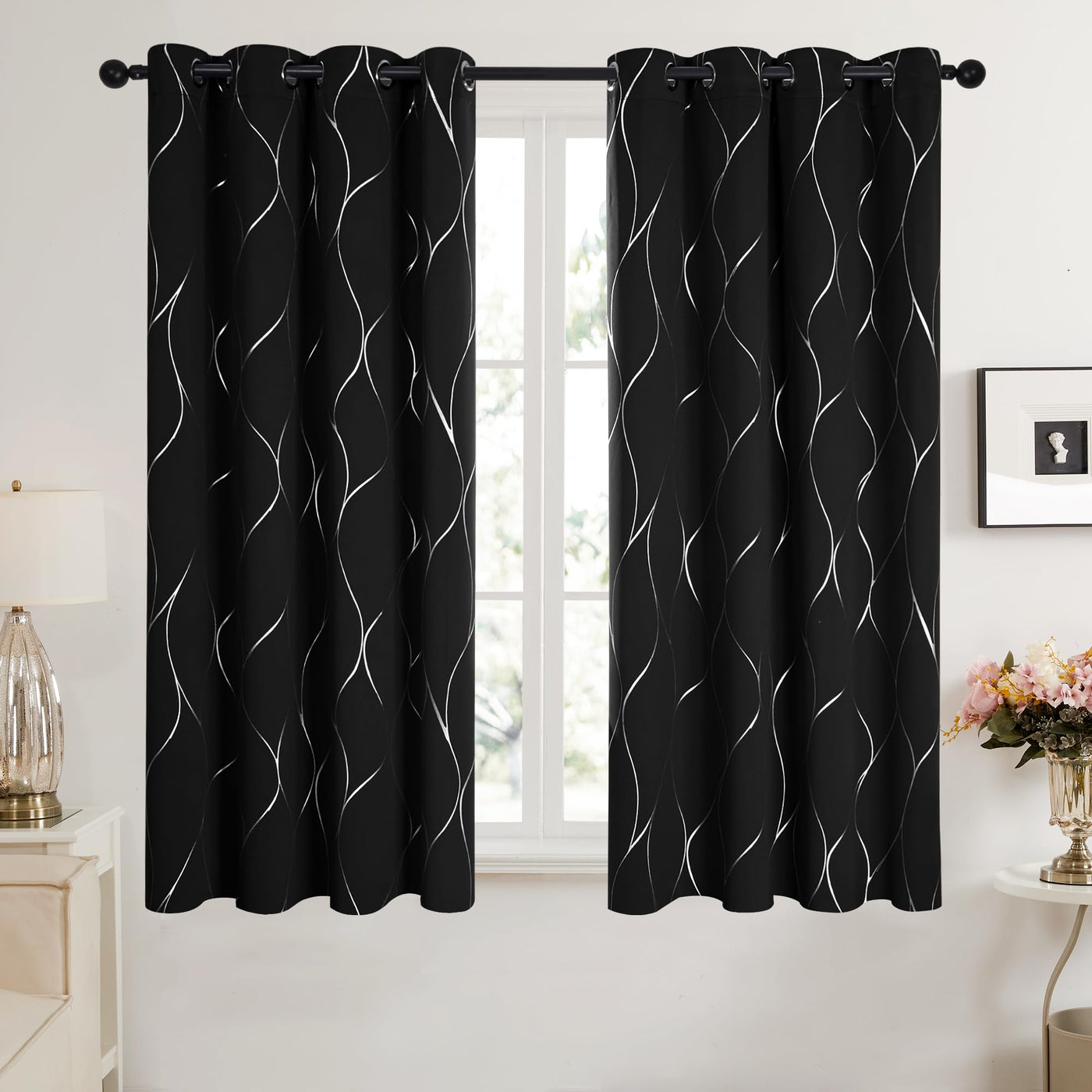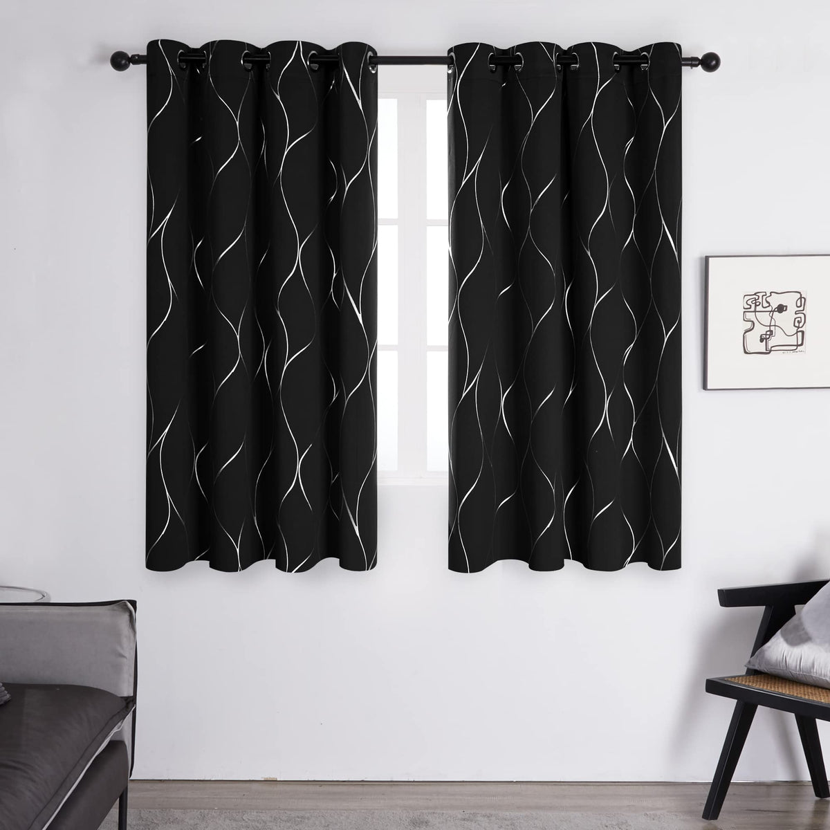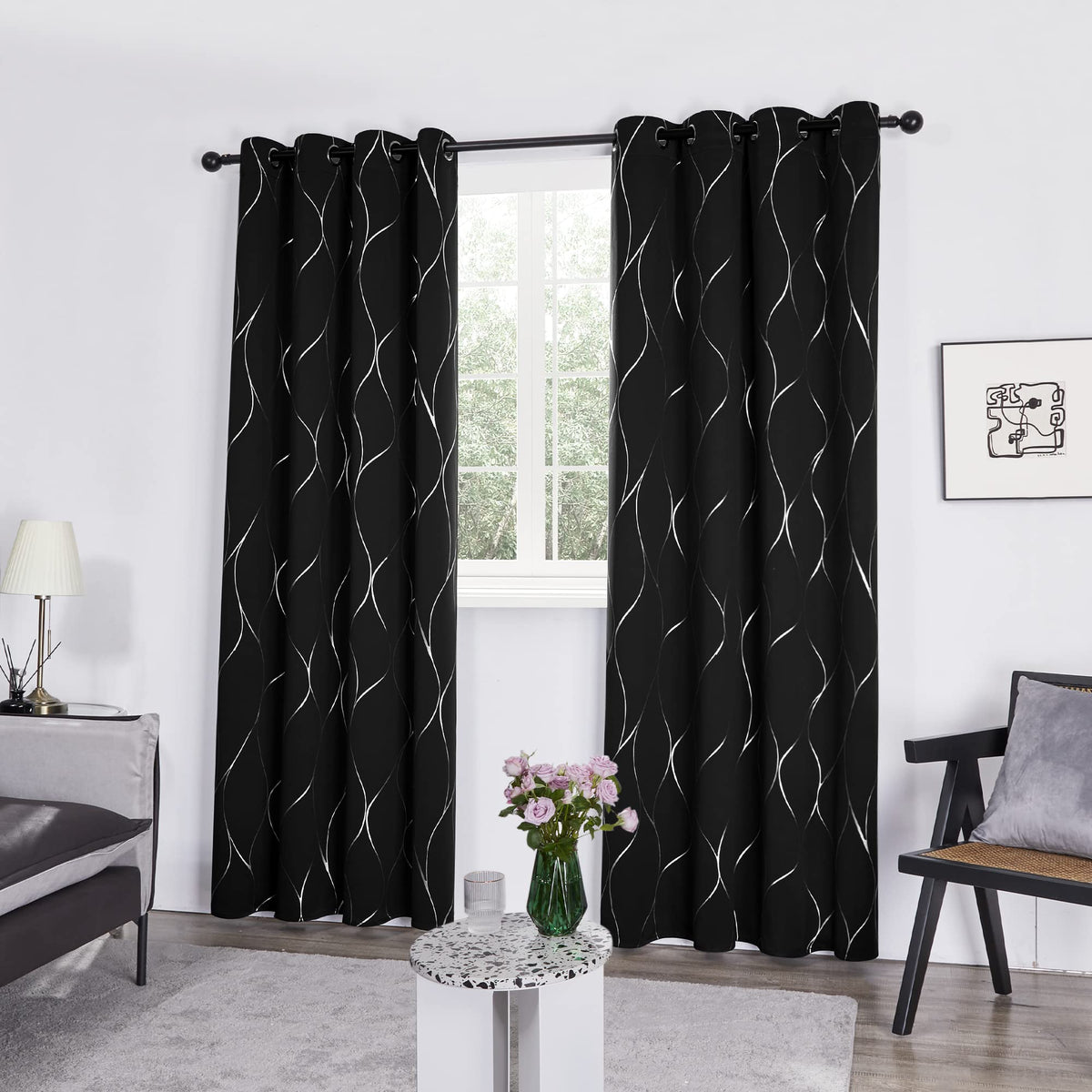 Deconovo Blackout Curtains, Wave Foil Print Pattern Room Darkening Curtain, Thermal Insulated Window Energy Saving Drapes For Bedroom (52W X 63L Inch, Set Of 2 Panels, Black)