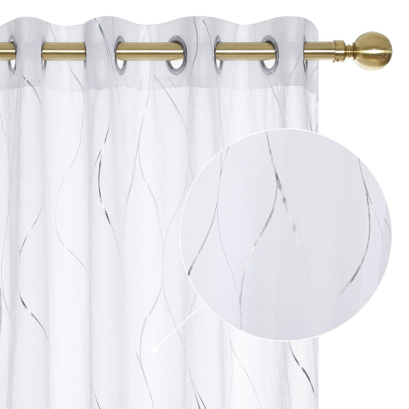 Deconovo White Sheer Curtains - Grommet Silver Foil Printed, Wave Pattern And Linen Look Voile Drapes, 52W X 84L In, 2 Panels