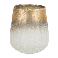Vase 5''D x 6''H Glass Enhance your home decor with this beautiful Decorative Glass Vase. The nuetral white base paired with the ombre gold accent is the perfect combination to create a stunning and chic display. The quality textured glass composition is sure to last for seasons to come. Complete the look by adding a bunch of dried florals or fresh garden picks to the vase. Measures 5 x 5 x 6 Primary Materials: Glass Reccommended for indoor or outdoor covered use only Candles sold separately