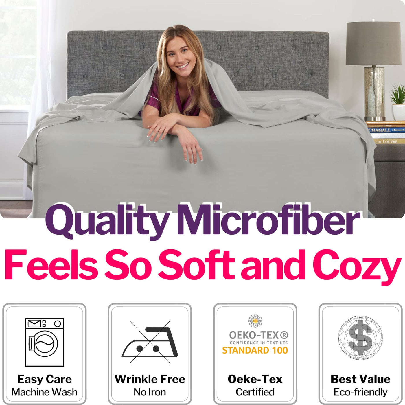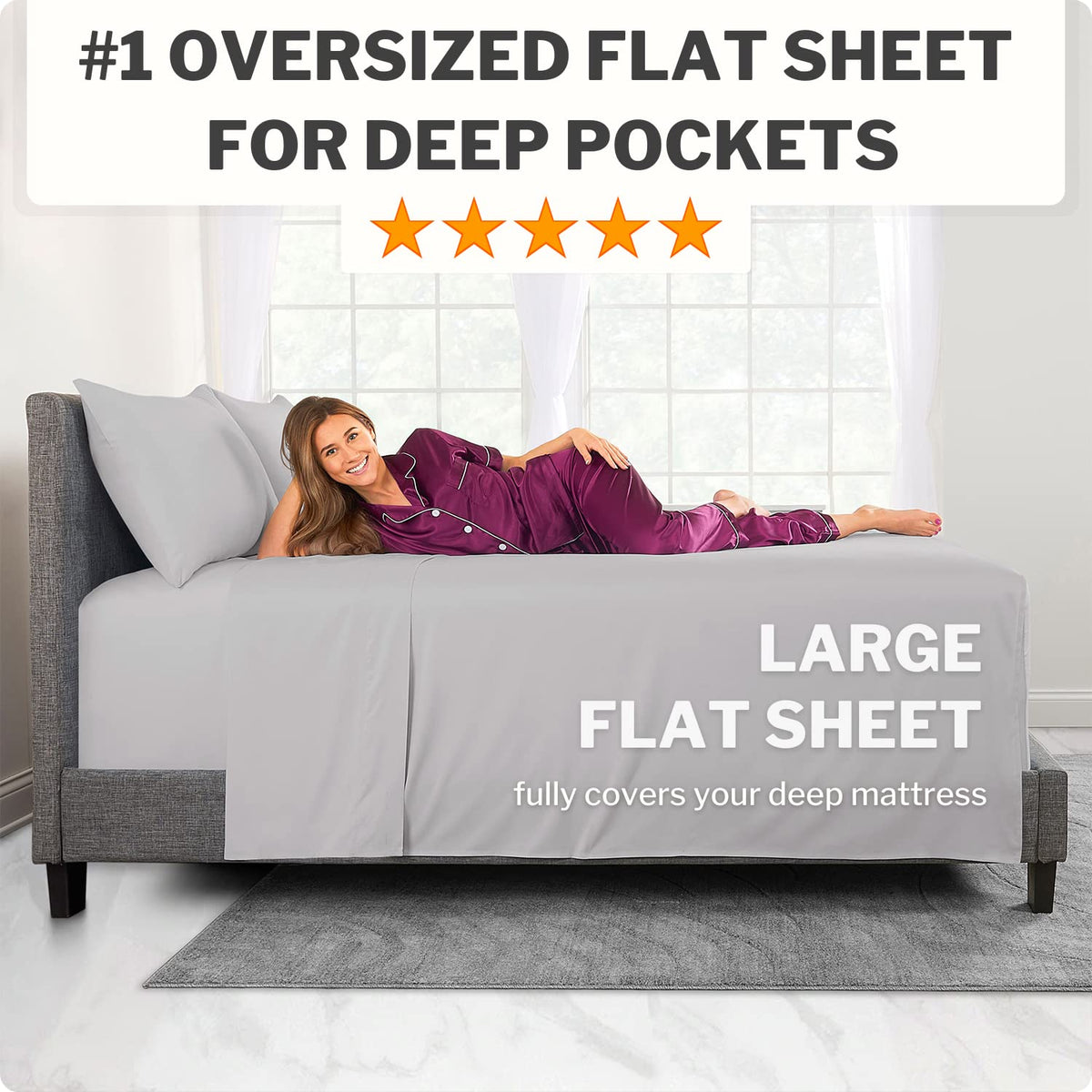 Deep Pocket Queen Bed Sheets - 4-Piece Includes: Real 16 Inch Extra Deep Pocket Fitted Sheet [Best-Fit For 14 -18 Mattress] - Oversize Flat Sheet - 1 Zipper Closure Pillowcase - Silver Light Gray