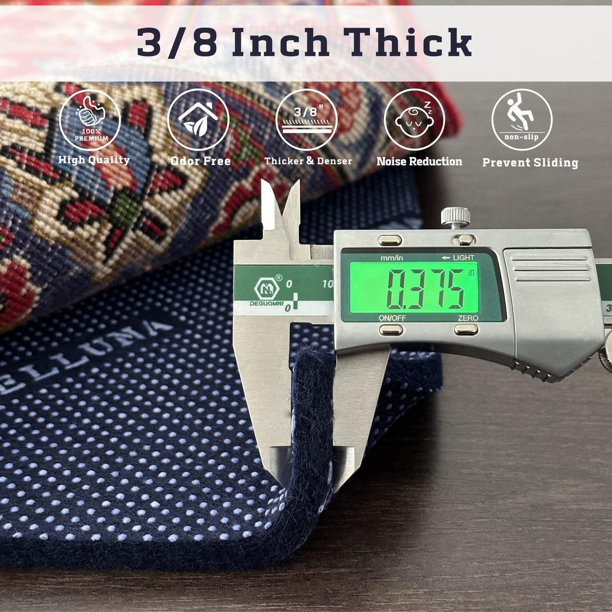 Q: How thick is the DELLUNA Non-Slip Area Rug Pad?A: The DELLUNA rug pad has a thickness of 3/8 inches, providing a luxurious cushioning experience. This thickness not only adds comfort but also offers soundproofing and insulation benefits.