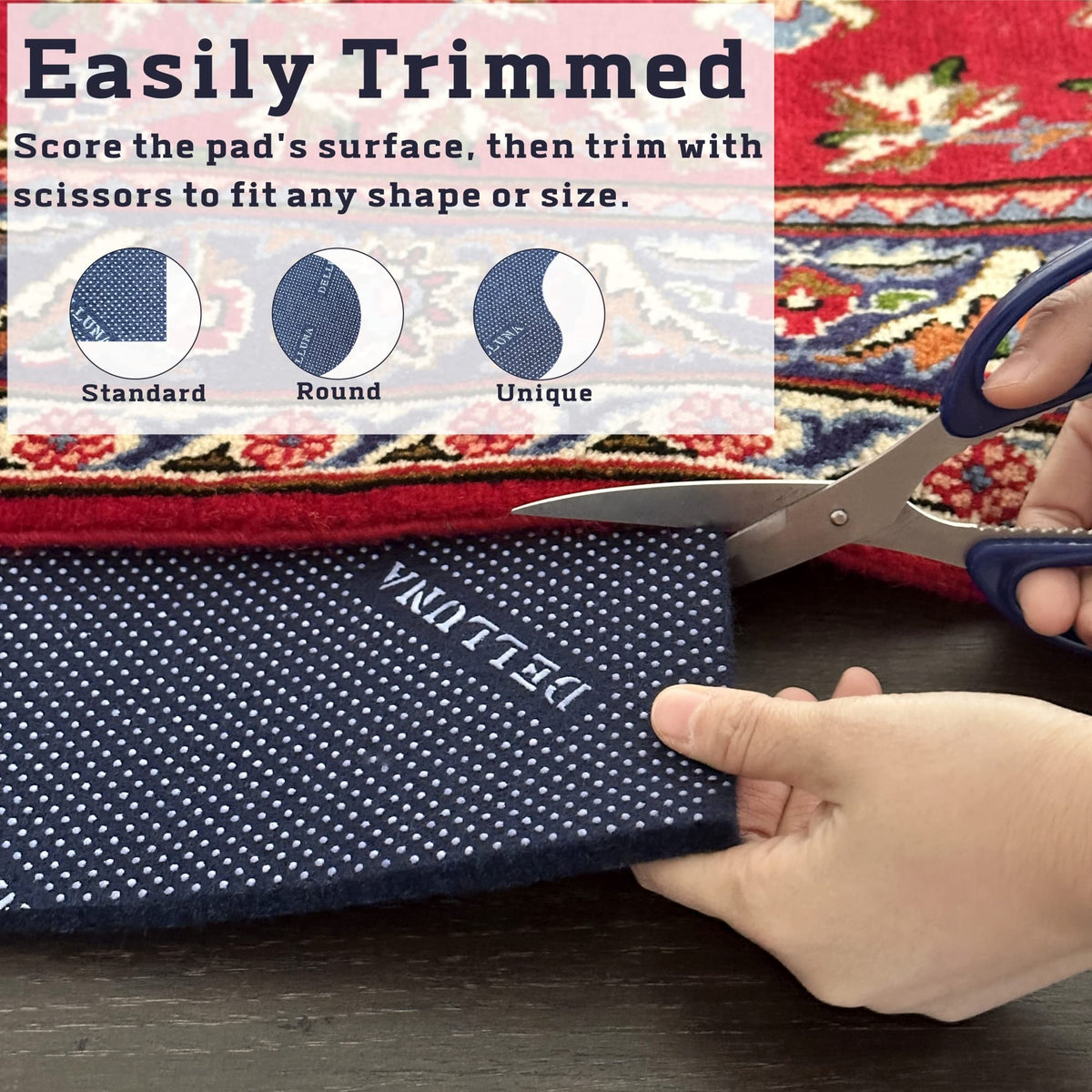 Q: Can the DELLUNA rug pad be cut to fit different rug sizes?A: Absolutely! The DELLUNA Non-Slip Area Rug Pad can be easily trimmed with scissors to fit your specific rug size. Just lay the pad down, place your rug on top, and cut any excess material as needed.