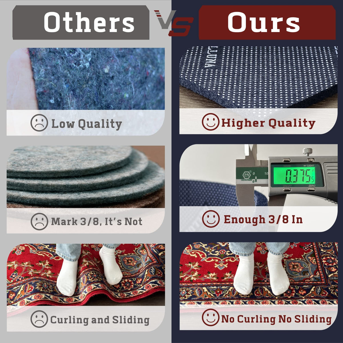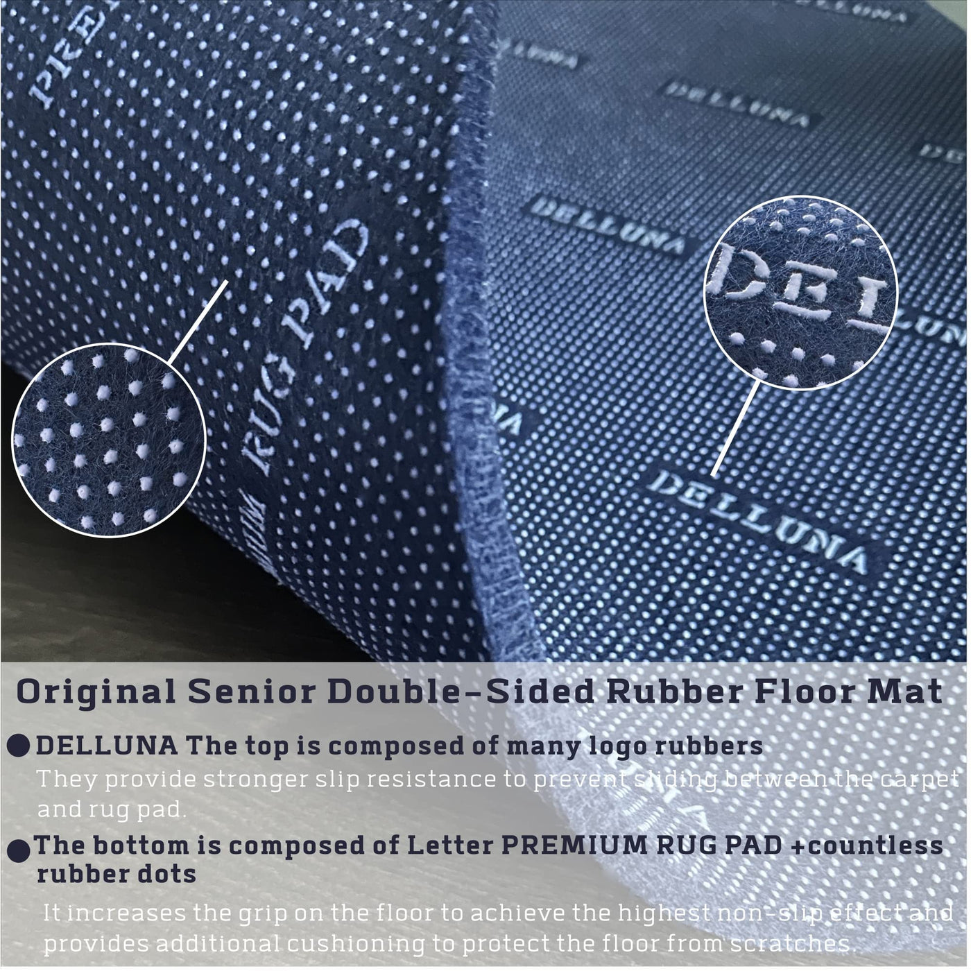Delluna Only Focuses On The Rug Pad Industry, Making Every Rug Pad With Heart. 3/8'' Is Our Premium Non-Slip Rug Pad--Self-Developed And Designed Double-Sided Rubber, The Bottom Side Is Composed Of Delluna Logo + Dot Rubber, It Increases The Gripping On The Floor And Provides Additional Cushioning To Protect The Floor From Scratches, The Top Side Is Composed Of Dense Small Dots, Providing Strong Slip Resistance To Prevent Sliding Between The Carpet And The Rug Pad, And The Middle Layer Is Made Of 100% High-Quality Felt Material, Contains 49Oz Felt. Firm Grip And Premium Protection Married With Lush Cushioning Underfoot To Make Your Rug Welcoming And Comfortable. Will Not Stain Nor Discolor Your Floors. The Most Important Thing Is That It Has A Good Anti-Slip Effect. It Does Not Require Any Furniture To Be Pressed On The Carpet, Just Spread It On The Carpet. Especially Suitable For Families With Children And The Elderly.Delluna Team Always Recommends The Use Of A Slip-Resistant Rug Pad Under Your Rug.