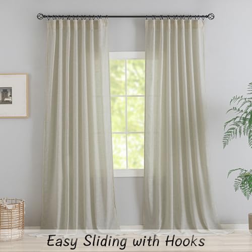 Donren Burlap Linen 144 Inch Length Curtains For Tall Floor Ceiling Villa Living Room- Tan Beige Back Tab Hooks Pleated Easy Open Sliding Semi Sheer 12 Foot Extra Long 2 Story Window Curtain Panels
