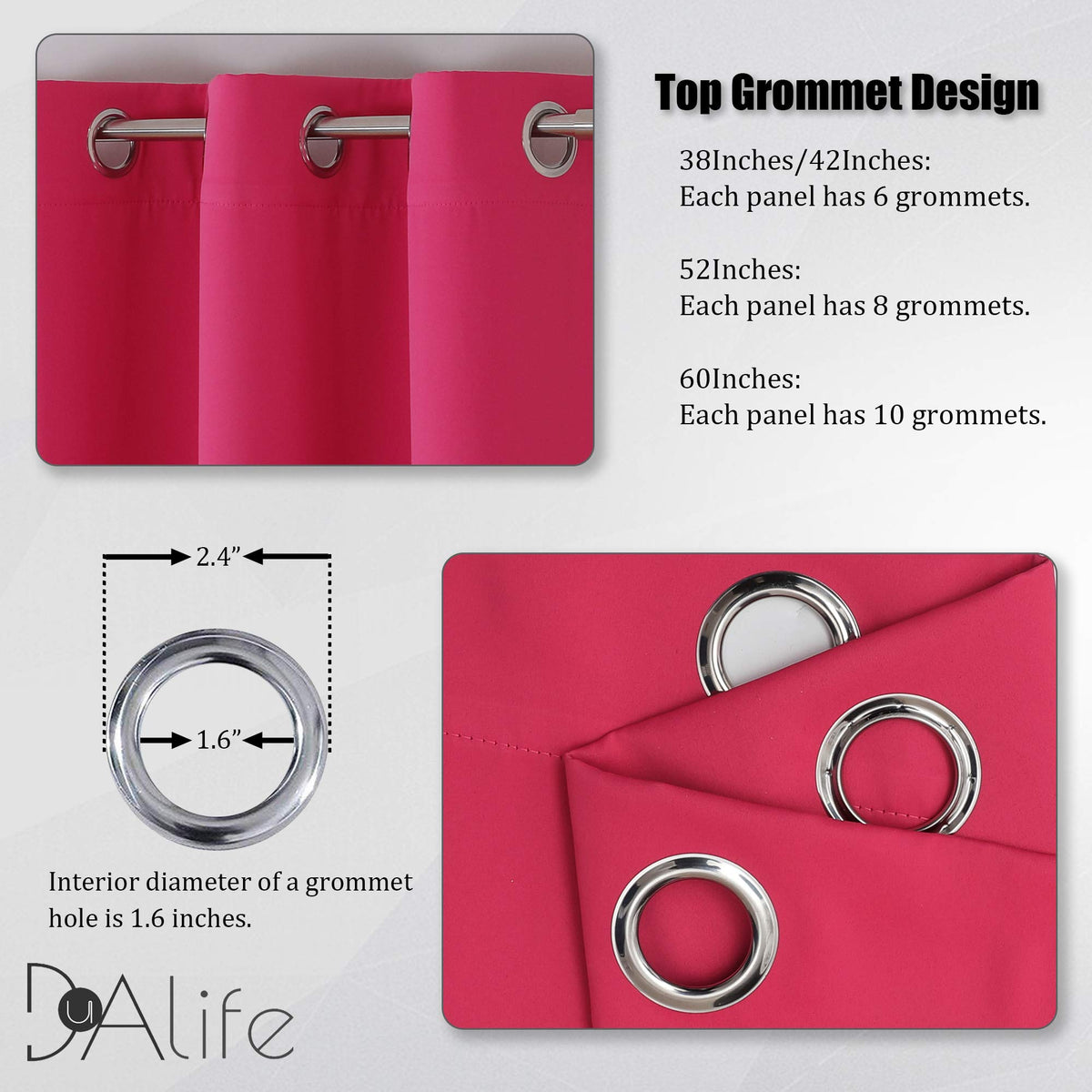 Dualife Blackout Curtain Panels34/38/42 Inches Wide-6 Silver Grommets Top52 Inches Wide-8 Silver Grommets Top60 Inches Wide-10 Silver Grommets Top Soft And Free From Chemical Smell&Nbsp;&Nbsp;&Nbsp;&Nbsp;&Nbsp;&Nbsp; Triple Weave Technology&Nbsp;&Nbsp;&Nbsp;&Nbsp; Perfect Shading Effect&Nbsp;&Nbsp;&Nbsp;&Nbsp; Same Color On Both Sidesdualife As A Facilitator Is To Safeguard Your Quality Of Life .''Dual'' Means Wonderful Quality &Amp; Fashionable Colors. Sweet Life With Happiness.