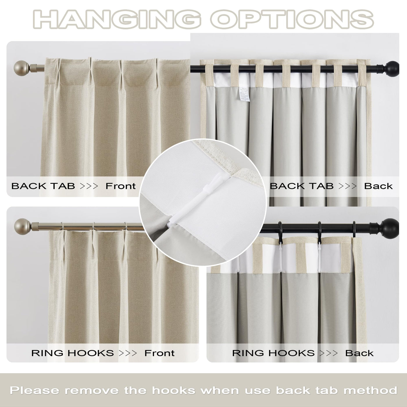 Q: Do these curtains come with hooks for hanging?A: Yes, the DUALIFE Natural Pleated Blackout Curtains come with 12 hooks included, allowing for easy installation on standard rods using either back tabs or ring hooks (rings not included).