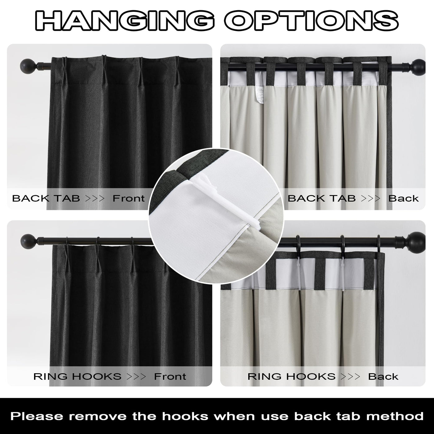 Q: Can I use these curtains with standard curtain rods?A: Yes, the DUALIFE Black Out Curtain Panels come with a 3.3-inch back tab design that fits most standard rods, and they offer two hanging options: back tabs and ring hooks (rings not included).