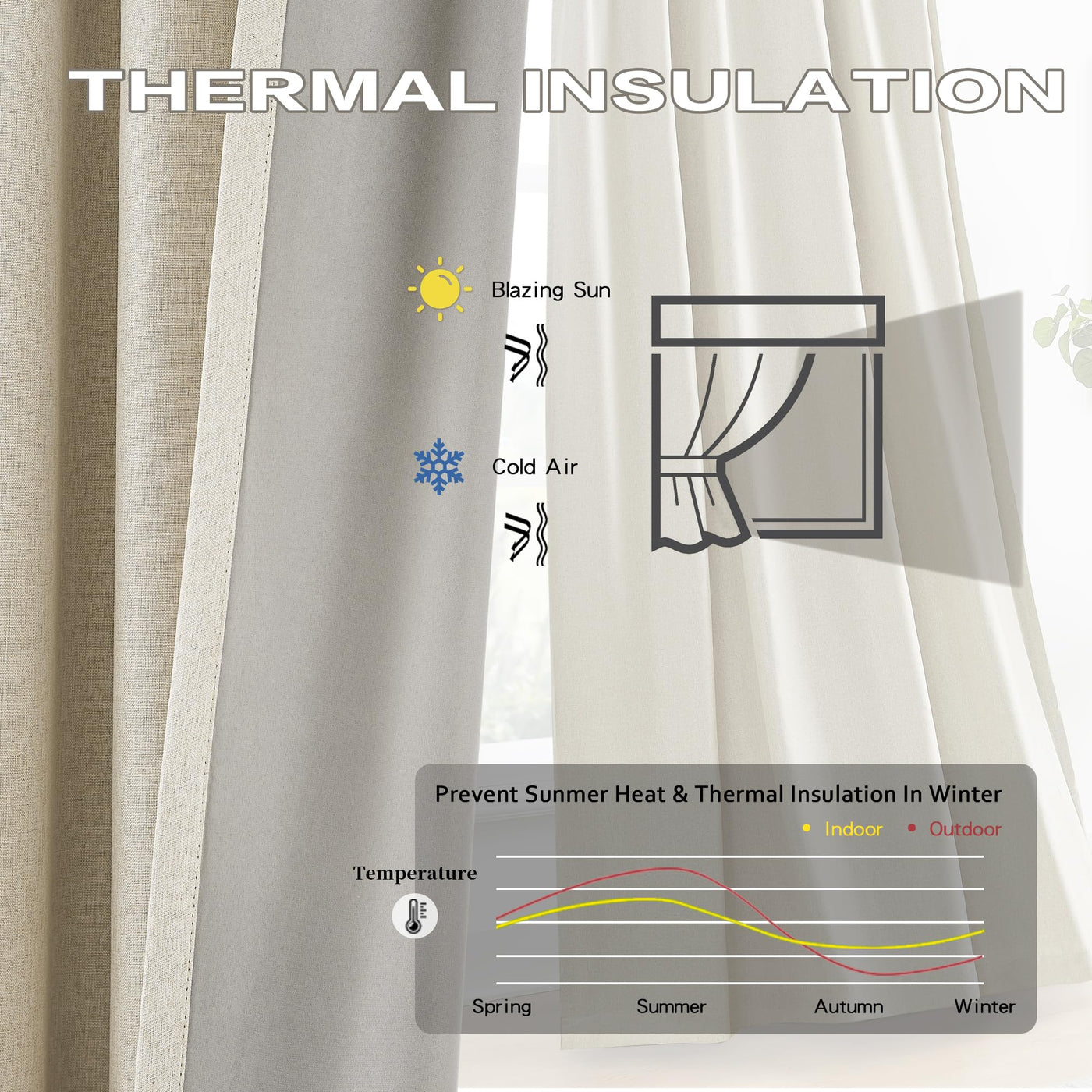 Q: What material are the DUALIFE curtains made from?A: The DUALIFE Blackout Thermal Curtains are crafted from a rich linen blend fabric with a 100% blackout coating, offering both a soft touch and an elegant appearance.