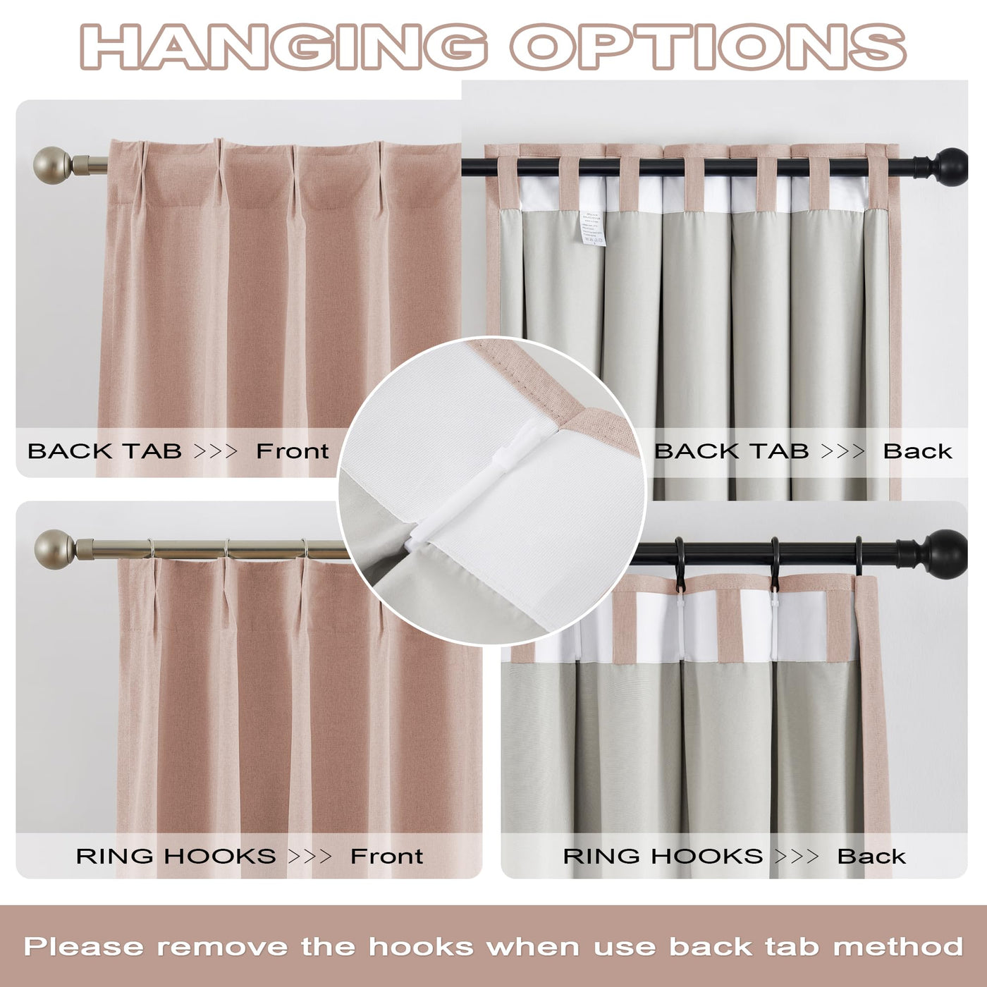 Q: How do I hang the DUALIFE curtains?A: The curtains offer two hanging options: back tabs and ring hooks (rings not included), allowing you to choose the method that best suits your window treatment style.