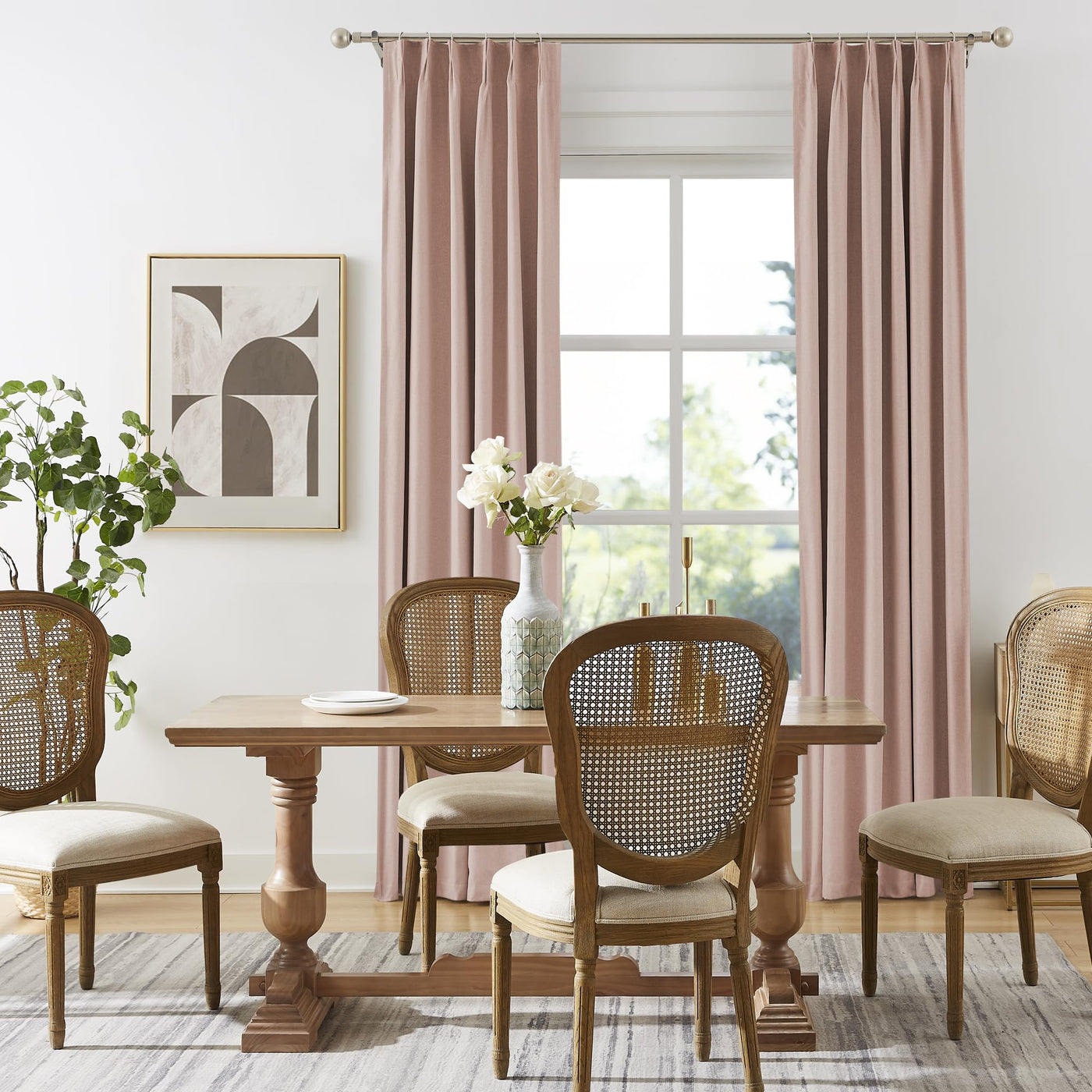 Q: What are the dimensions of the DUALIFE Dusty Pink Pinch Pleated Blackout Curtains?A: Each panel of the DUALIFE Dusty Pink Pinch Pleated Blackout Curtains measures 40 inches in width and 96 inches in length. The package includes 2 panels.