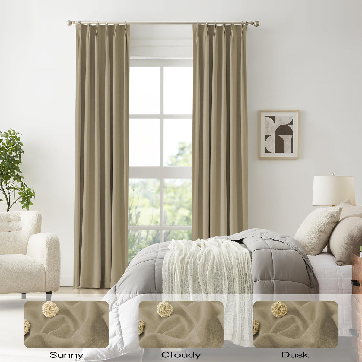 Dualife Taupe Blackout Curtains For Bedroom 90 Inch Length, Linen Pencil Pleat Farmhouse Traverse 100% Black Out Heat & Cold Bac