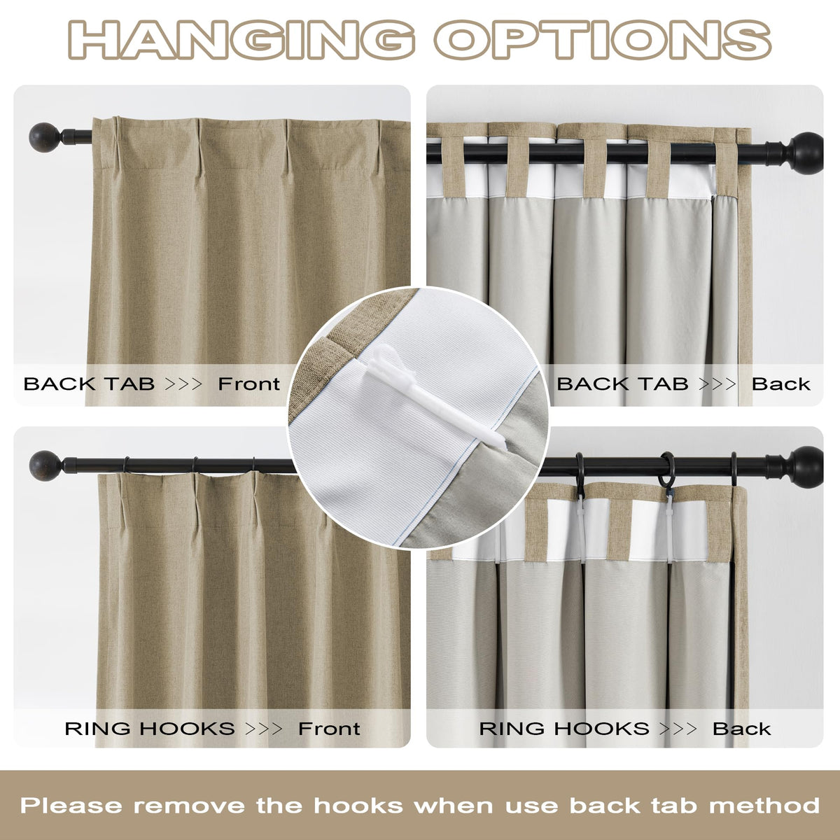 Q: What hanging options are available for these curtains?A: The DUALIFE blackout curtains offer flexibility in hanging options with back tabs and ring hooks, allowing you to choose the best method for your window treatment needs.