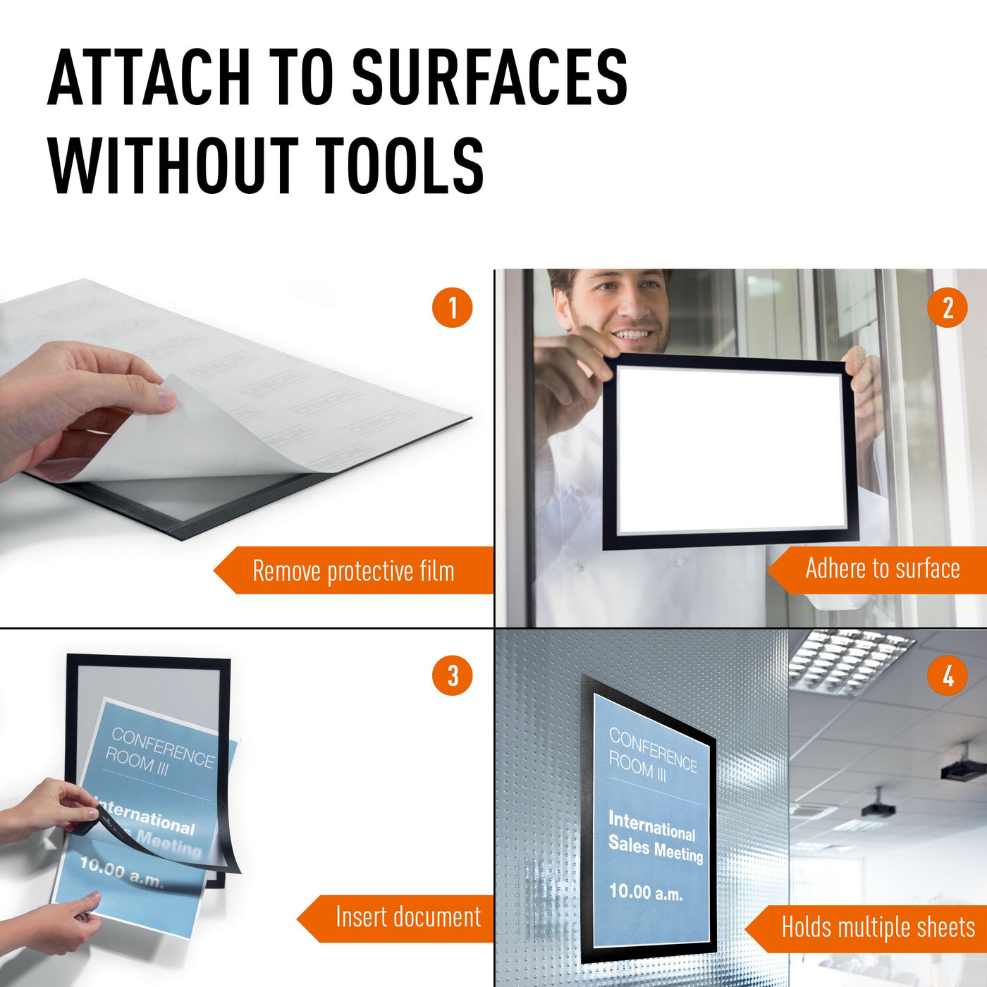 Self-adhesive, repositionable frames adhere to any smooth, solid surface like glass and metal. Simply peel, stick and you're done. Frame can be positioned horizontally or vertically to showcase your letter-size certificates or documentation. It is nonremovable on wallpaper, painted surfaces and wood. Sturdy cover pulls back effortlessly for speedy insert updates. Magnetic seal holds inserts securely in place. Frame can be read from both sides when affixed to transparent surfaces, such as glass.