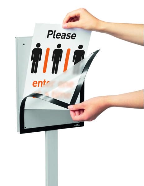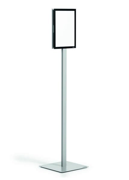 Use this Info Stand Basic Floor Stand to showcase important information and guide customers and guests with its double-sided readability. Easily change your message or direction of the Duraframe using the magnetically adhering frames that are fixed to metal plates. High-quality profile and a weighted base with rubber buffers deliver high stability of this dependable sign. Innovative, plug-in mechanism allows easy reversal from portrait to landscape formats without tools. Information stand is ideal for reception areas, trade fairs, lobbies and waiting rooms. It is compatible with letter-size inserts.