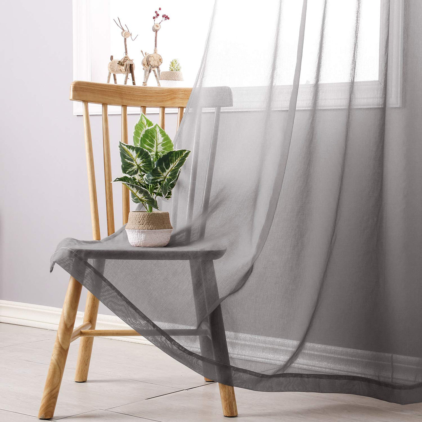 Q: What are the dimensions of the DWCN Faux Linen Grey Ombre Sheer Curtains?A: Each panel of the DWCN Faux Linen Grey Ombre Sheer Curtains measures 52 inches in width and 84 inches in length, making the total size for the set of two panels 104 inches wide by 84 inches long.