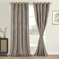 Q: What is the material and color of these curtains?A: The curtains are made from a soft, luxurious velvet material and are available in a taupe color, which adds a neutral and elegant touch to any room.